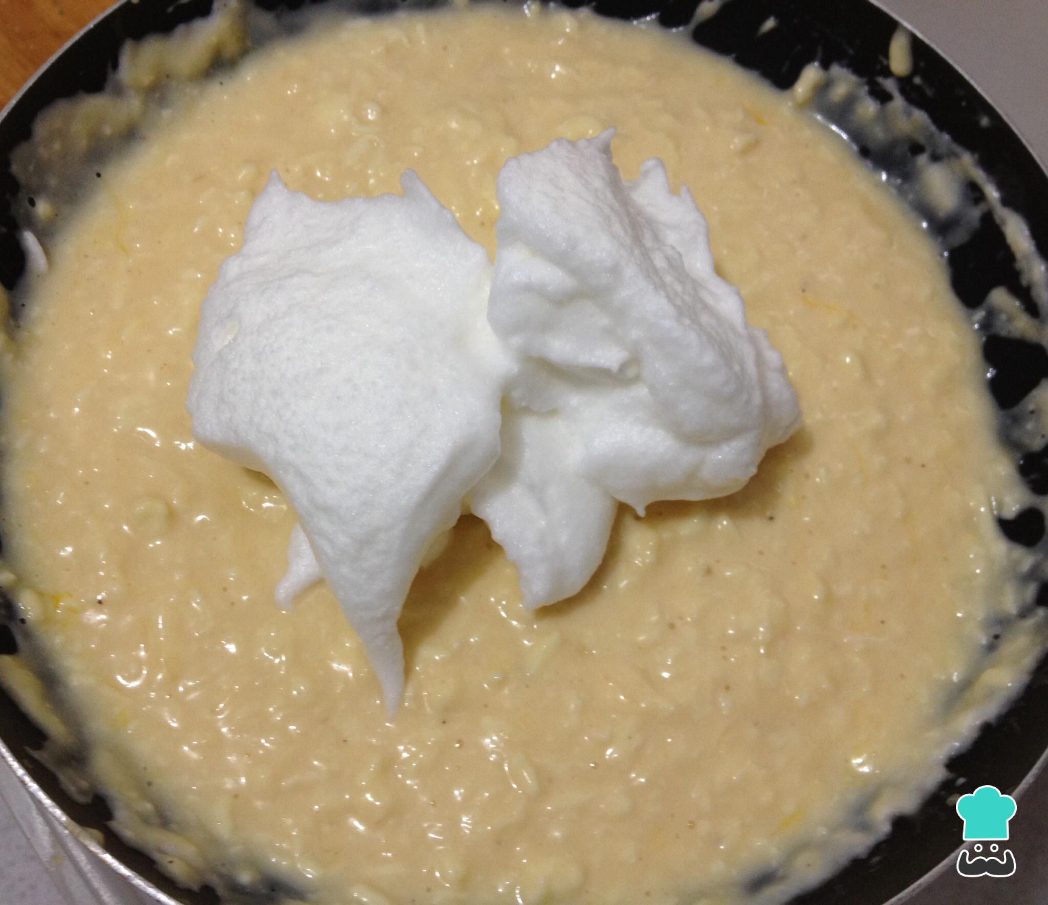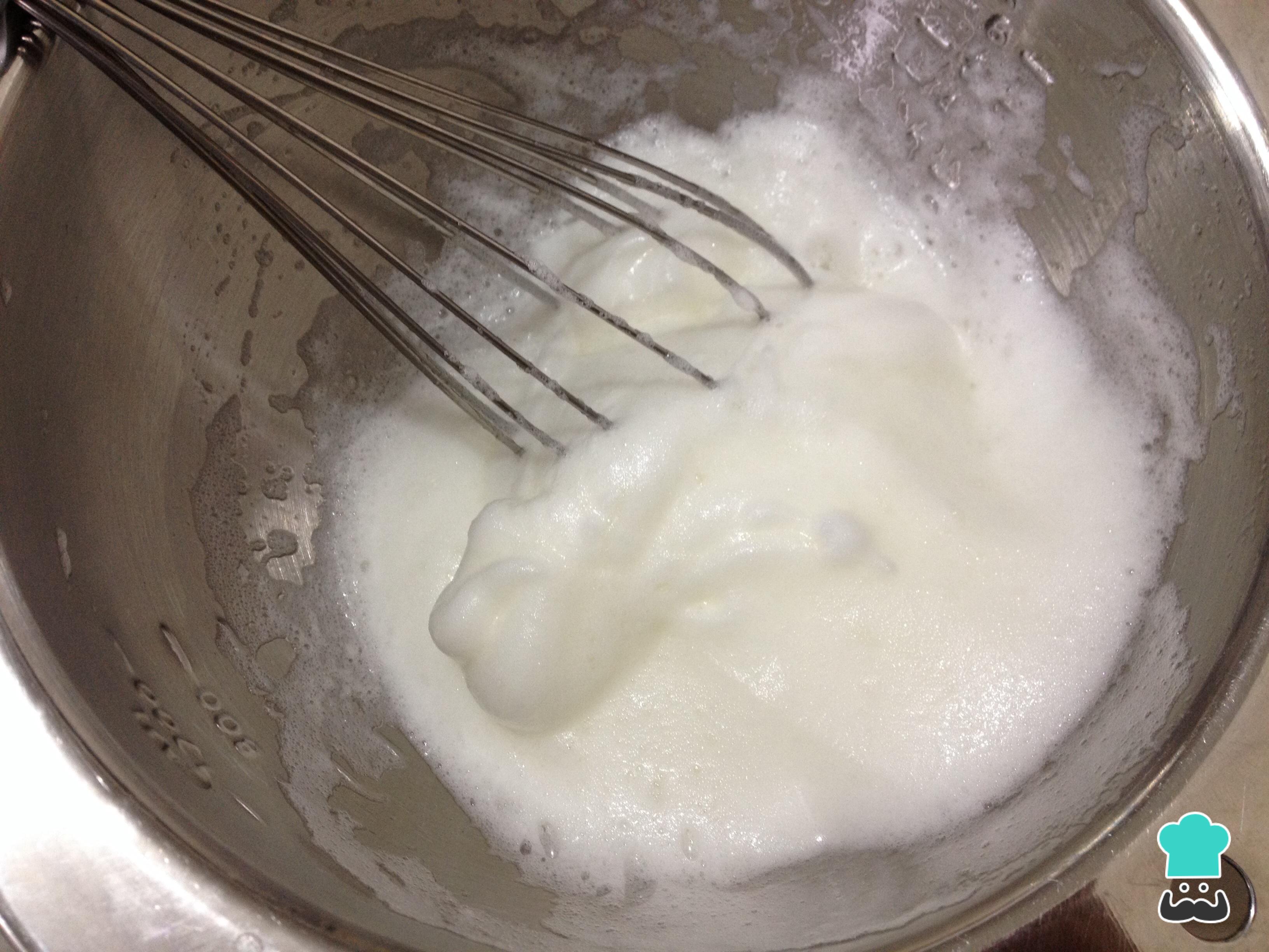 Agregar las claras de a poco y mezcla con movimiento envolventes para evitar que se baje el aire obtenido.