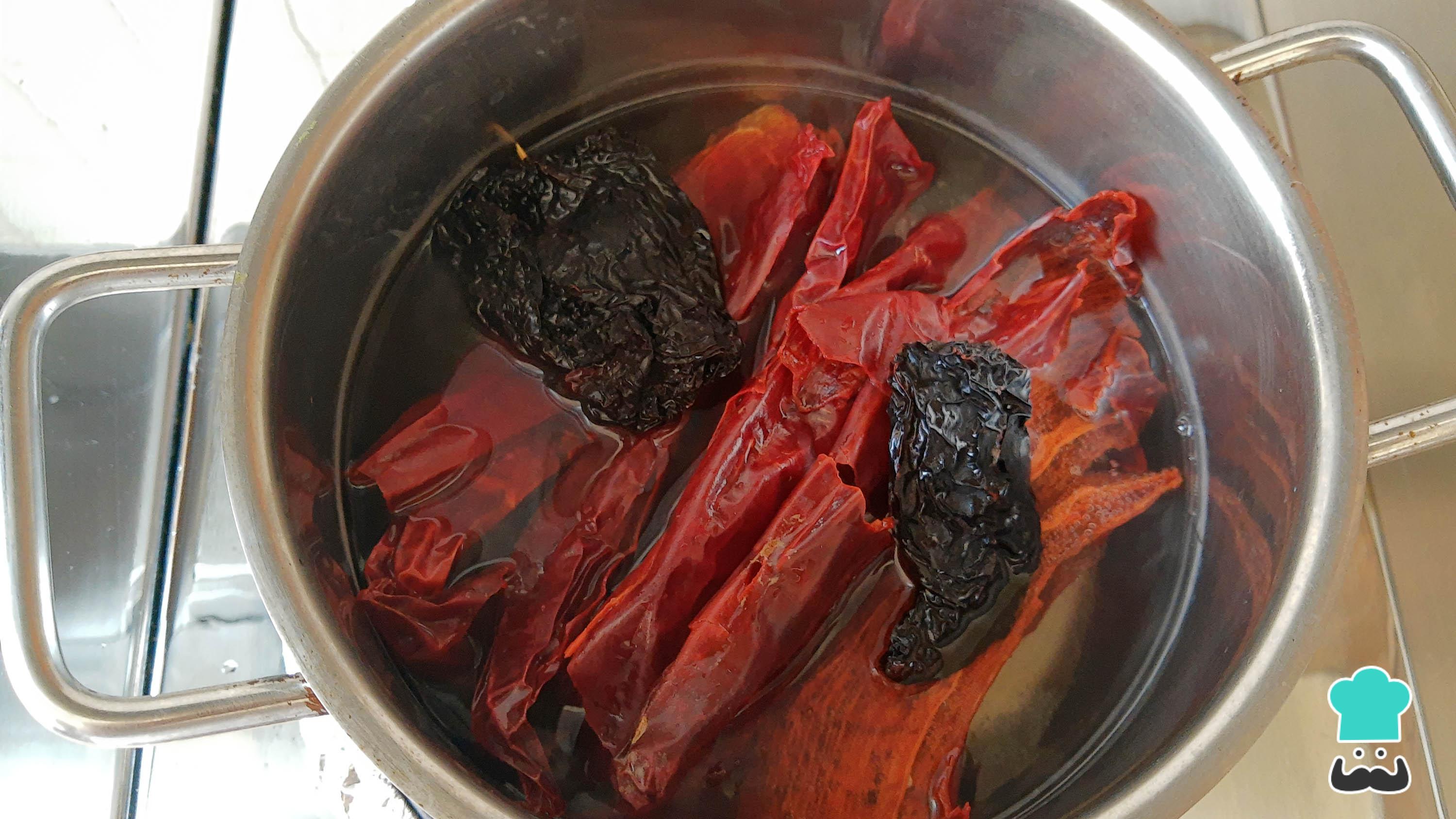 Para preparar los mixiotes de pollo, hierve 3 tazas de agua, agrega los chiles sin semillas y sin tallo y deja que se suavicen durante unos minutos.