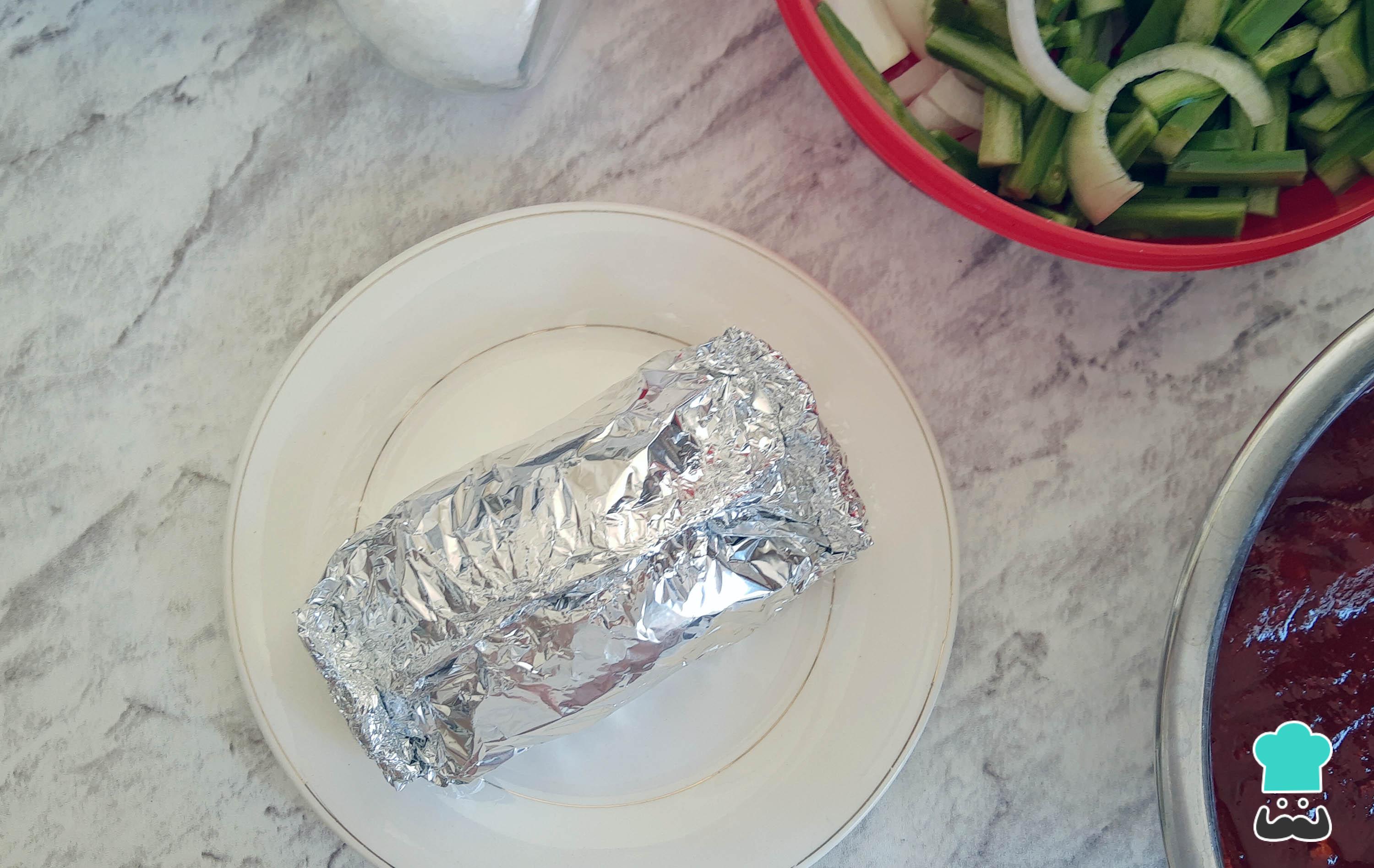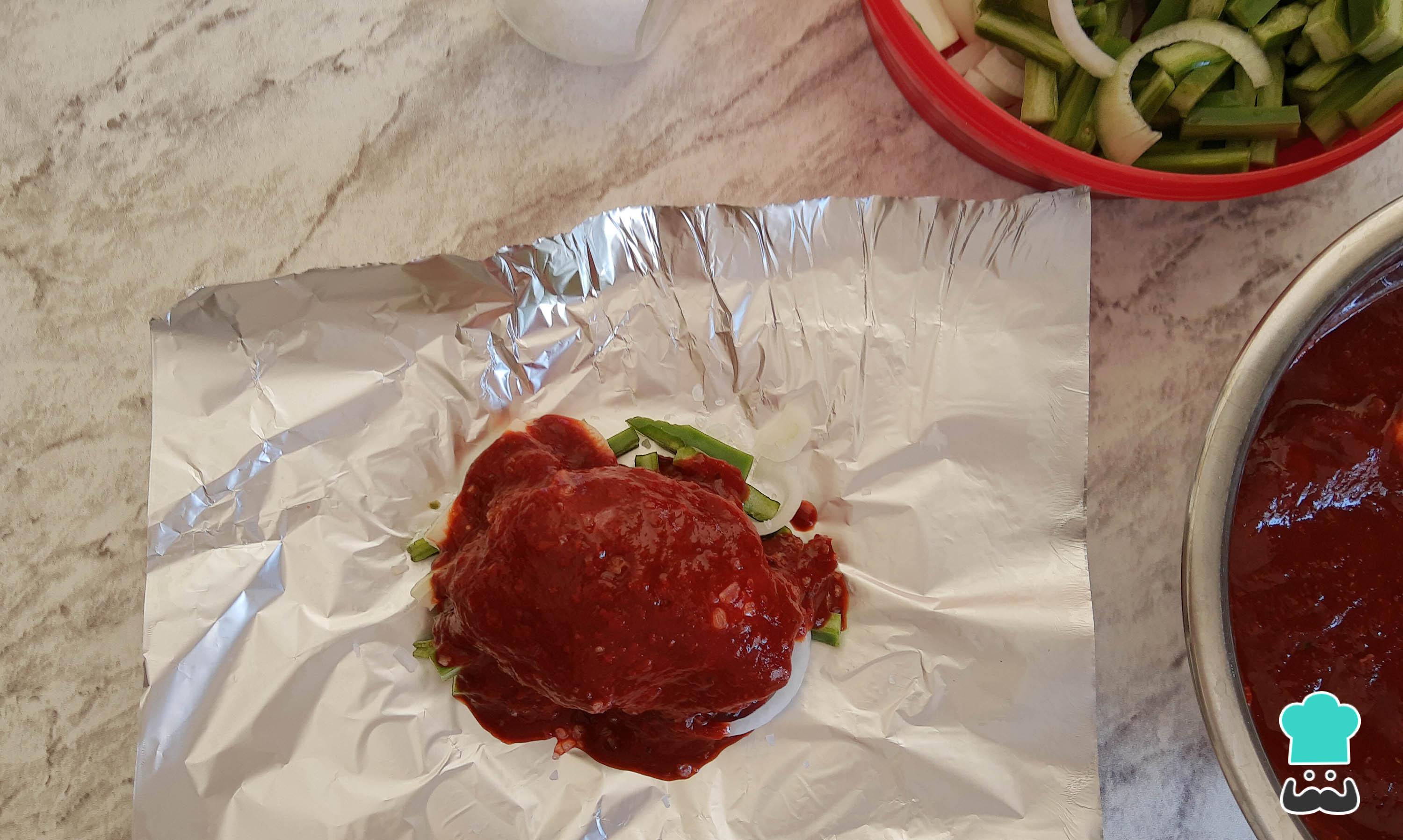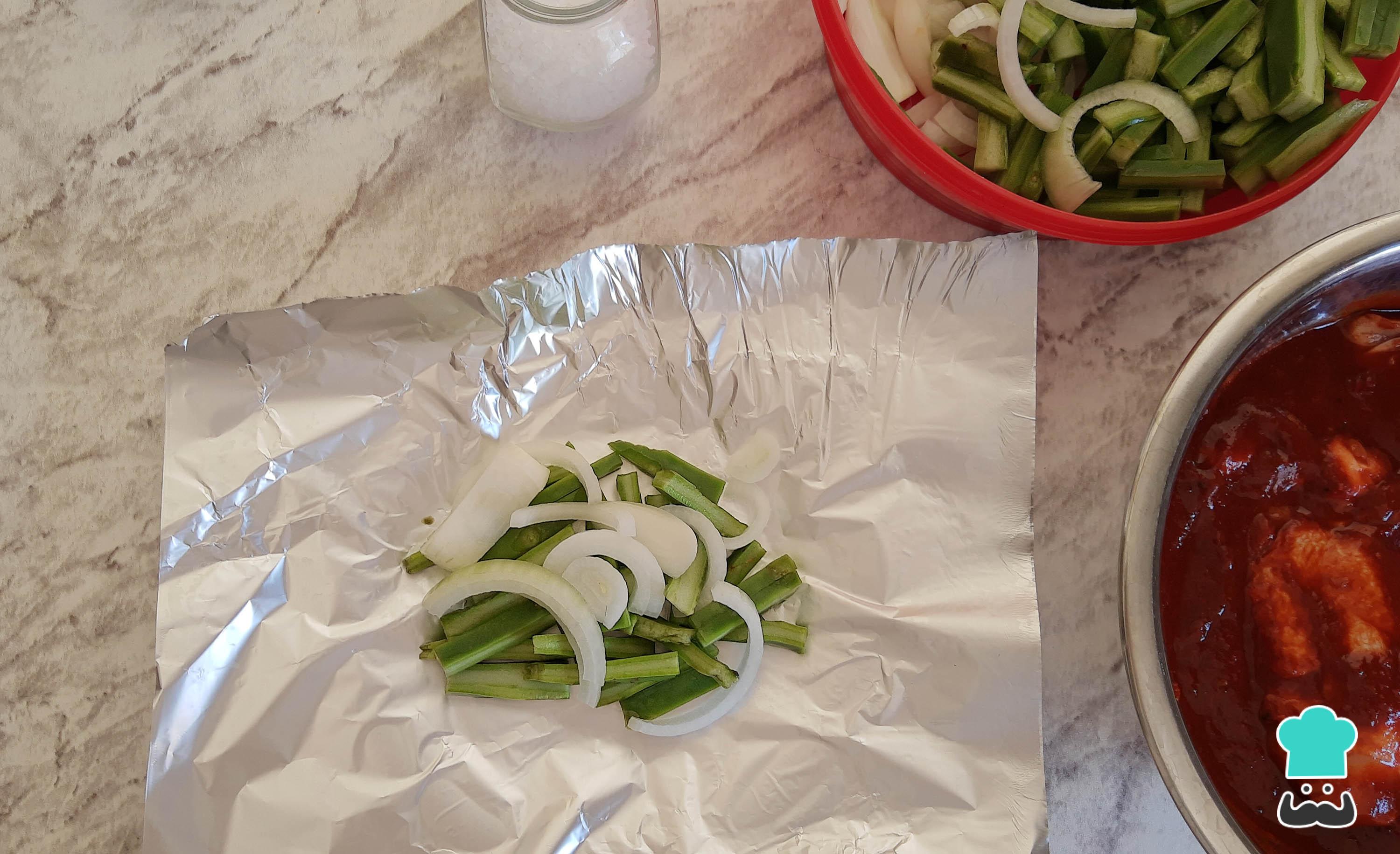 Pasado el tiempo de marinado, extiende una hoja de aluminio, coloca una cama de nopales y cebolla cortados y añade sal al gusto.