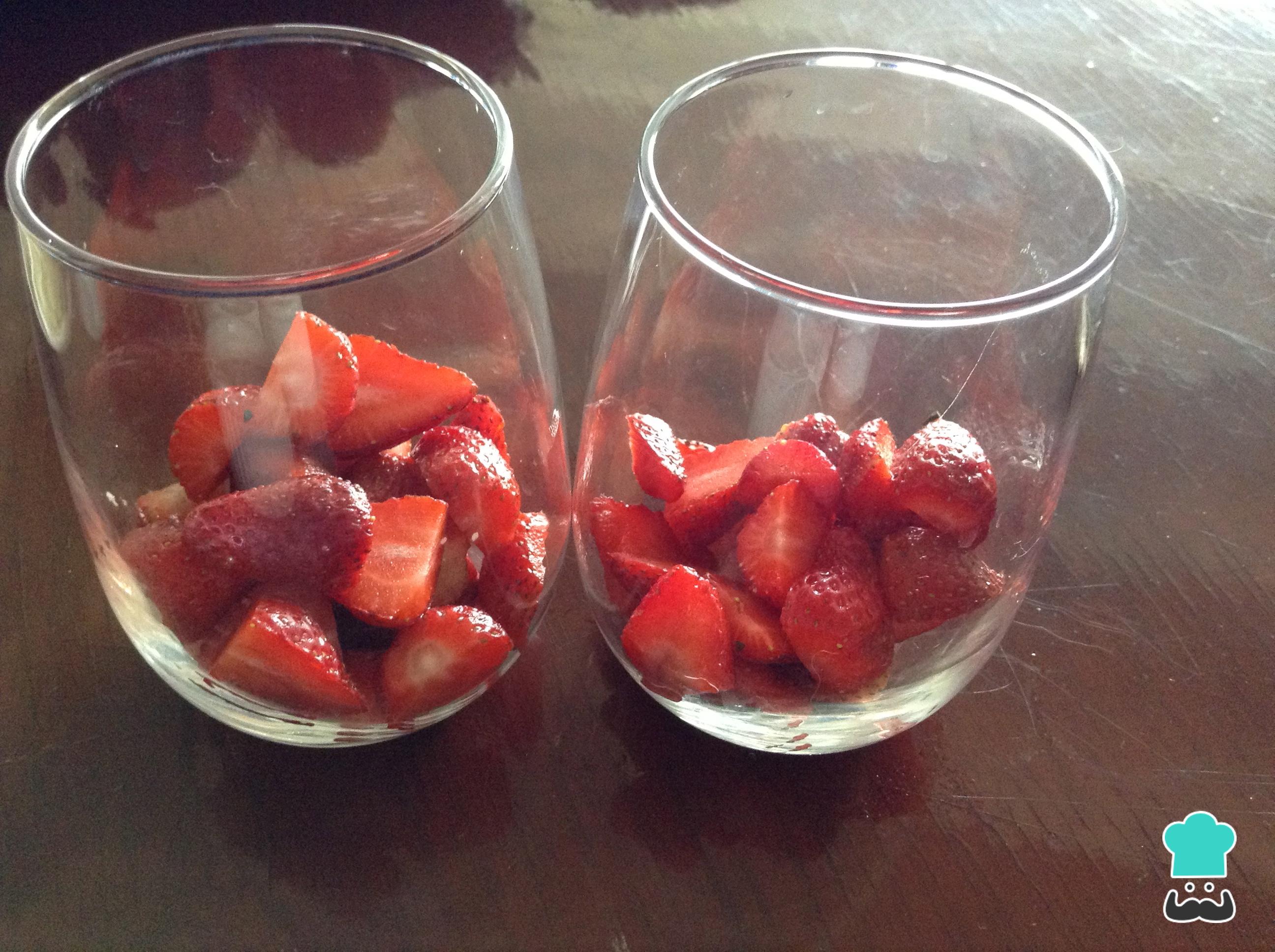 Lavar las fresas y retirar el tallo. Cortar en las mitades y llevar los vasos de vidrio para realizar el mojito de fresa y limón refrescante.