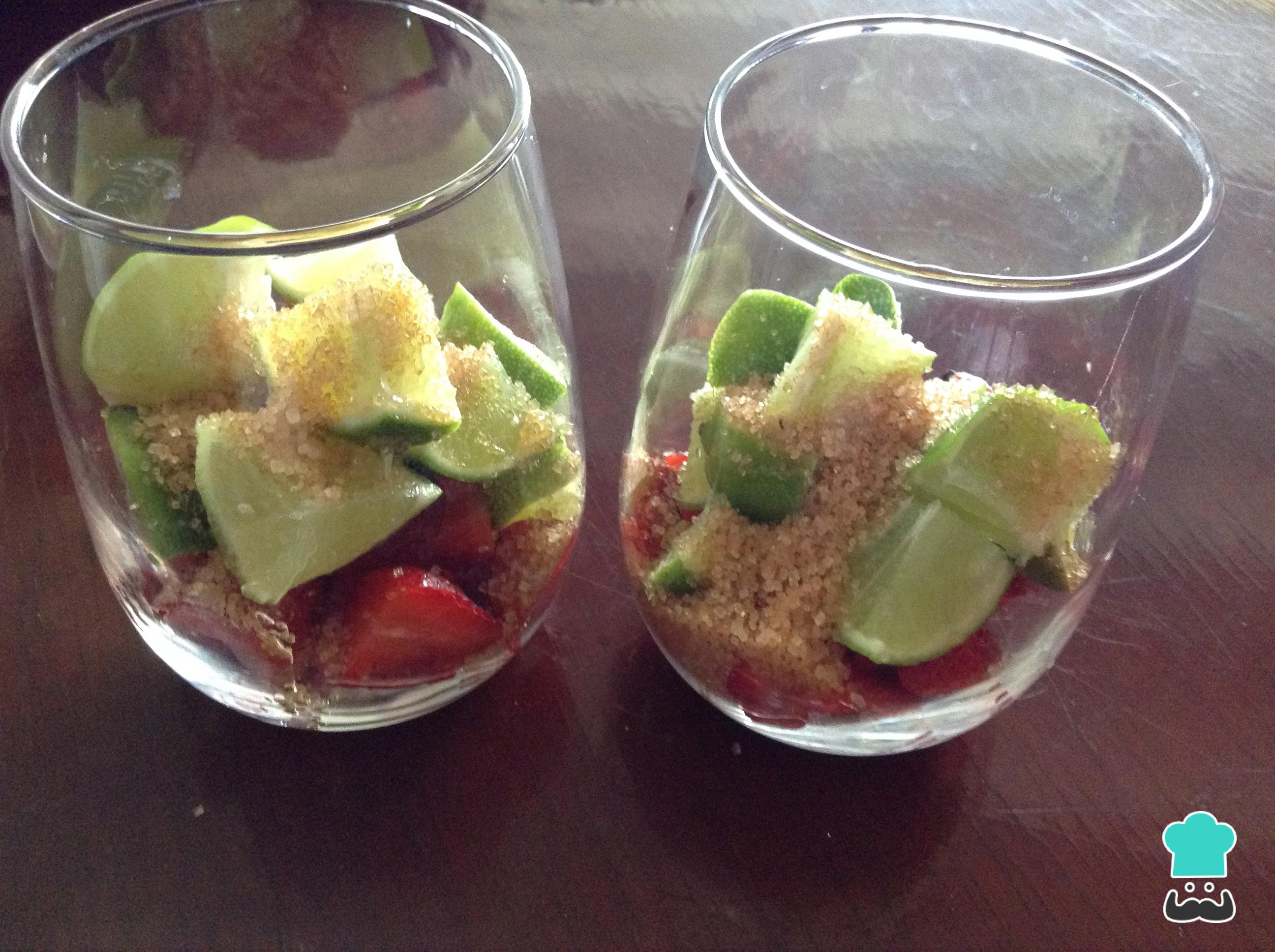 Adicionar los limones en cuadros medianos y una cucharada de azúcar morena. Macerar para que suelten sus jugos tanto el limón como las fresas.