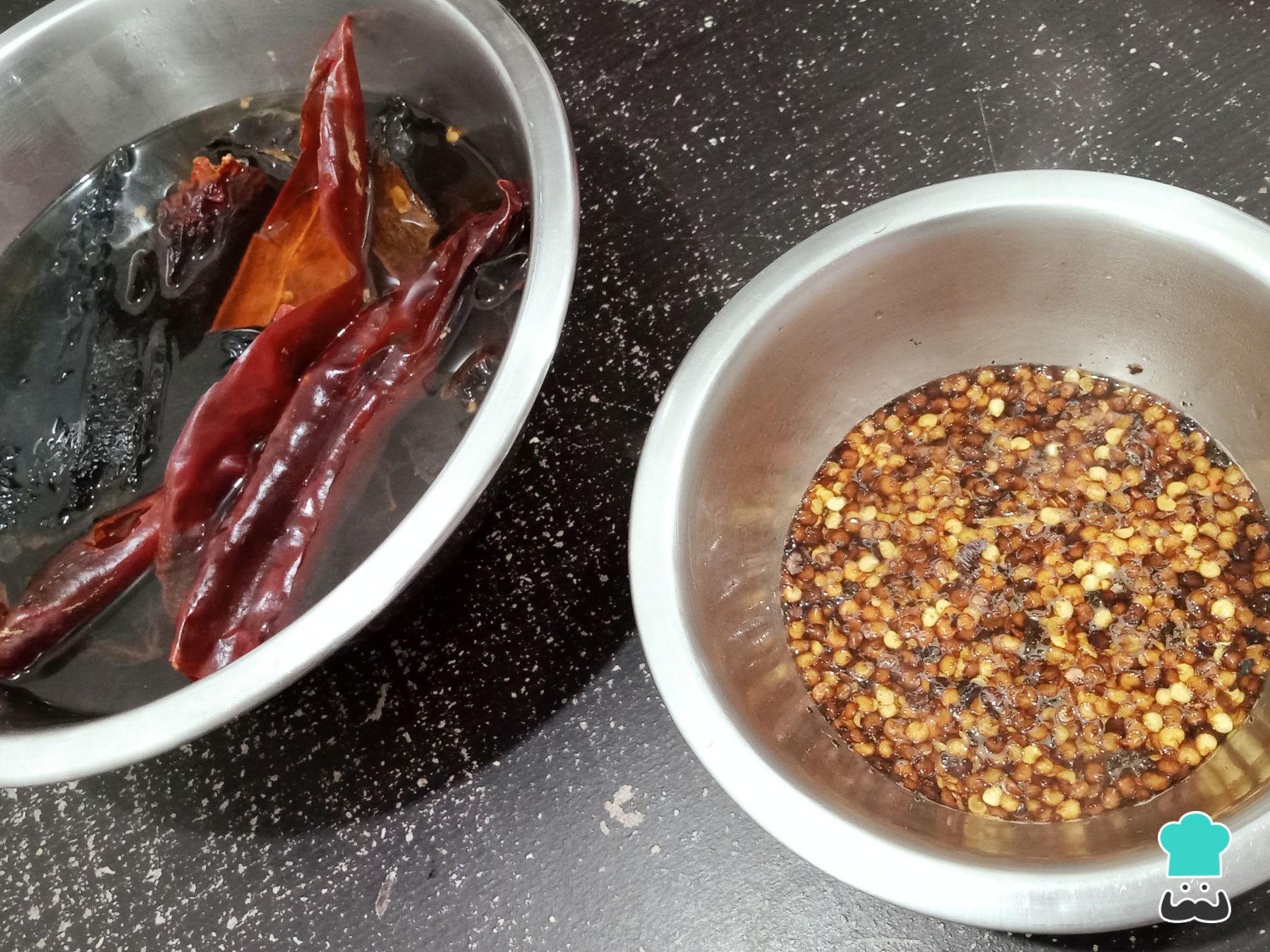 Remoja los chiles en agua caliente por 1 hora.Cambia el agua cada 15 minutos y repite esta operación 4 veces. Haz lo mismo con las semillas.