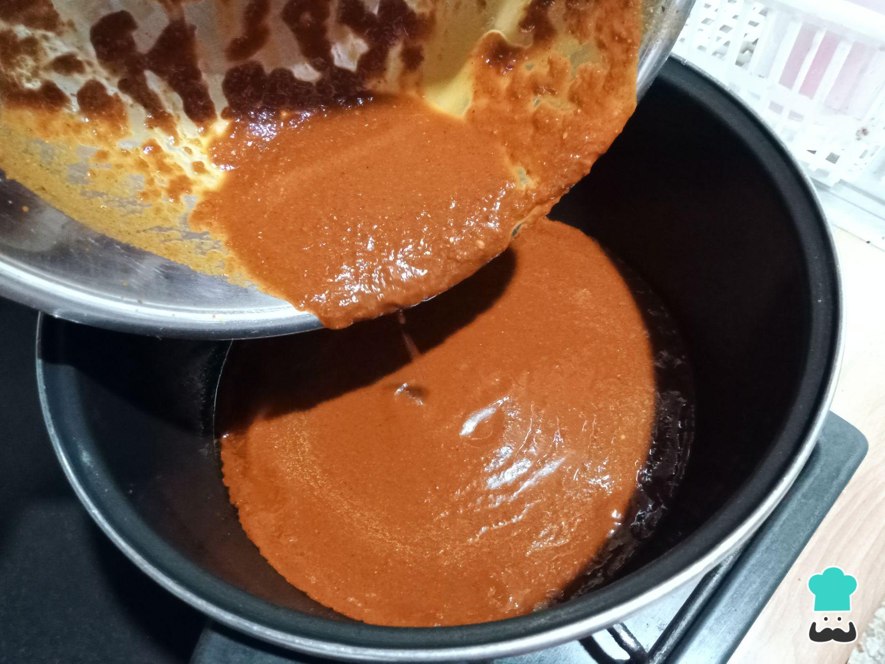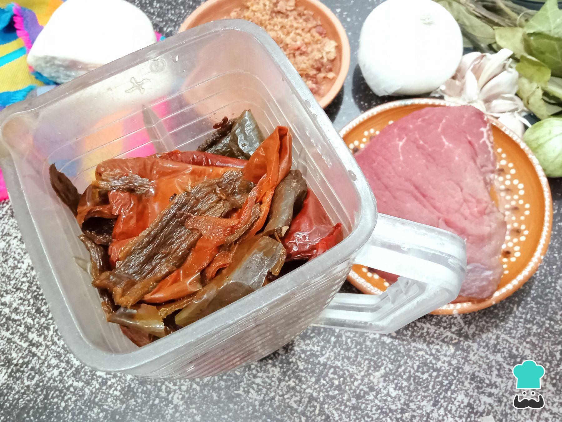 Licúa las tortillas, chiles, especias, semillas y vegetales. Agrega un poco de caldo de res si es necesario para facilitar el proceso. Cuela todo cuando esté perfectamente molido.