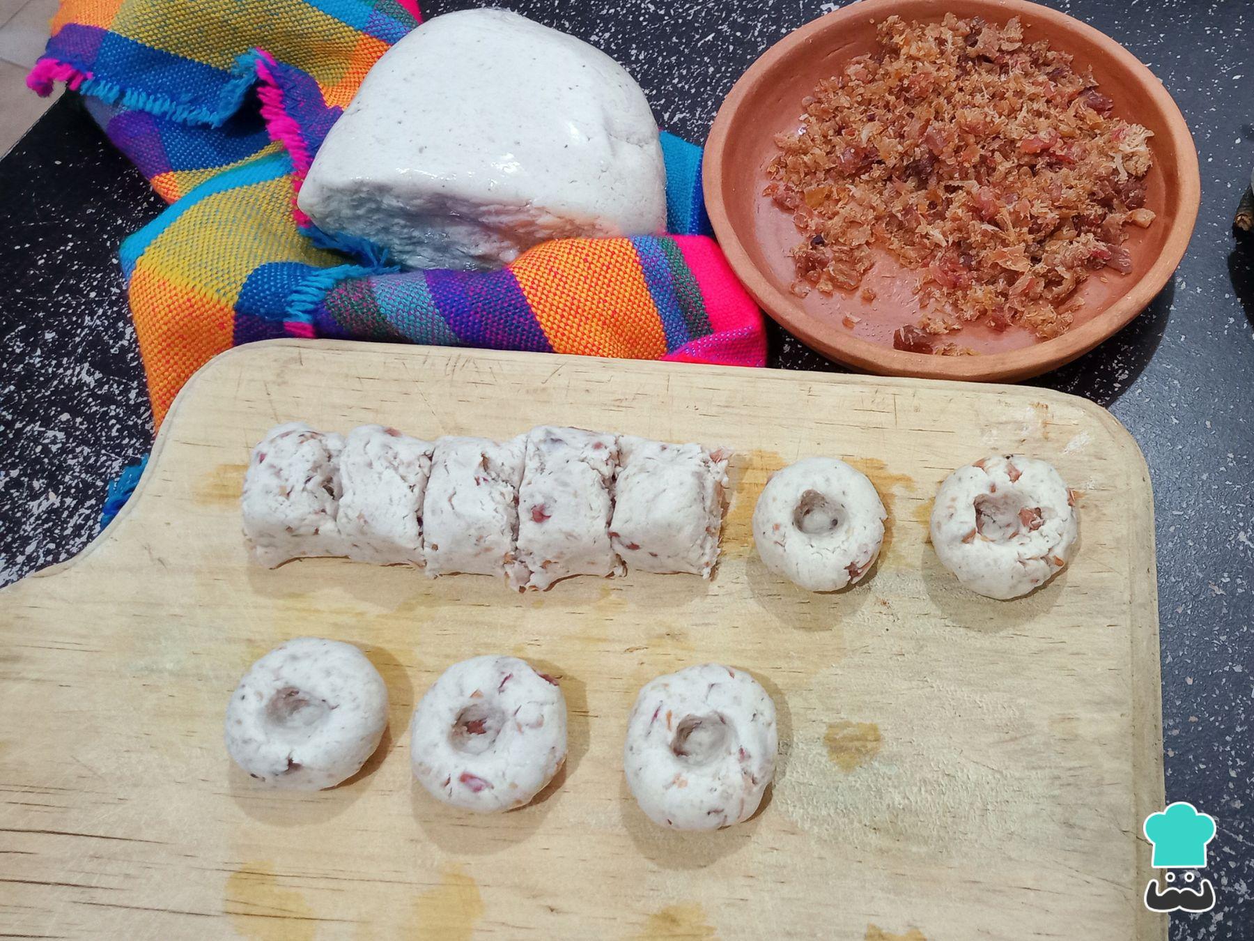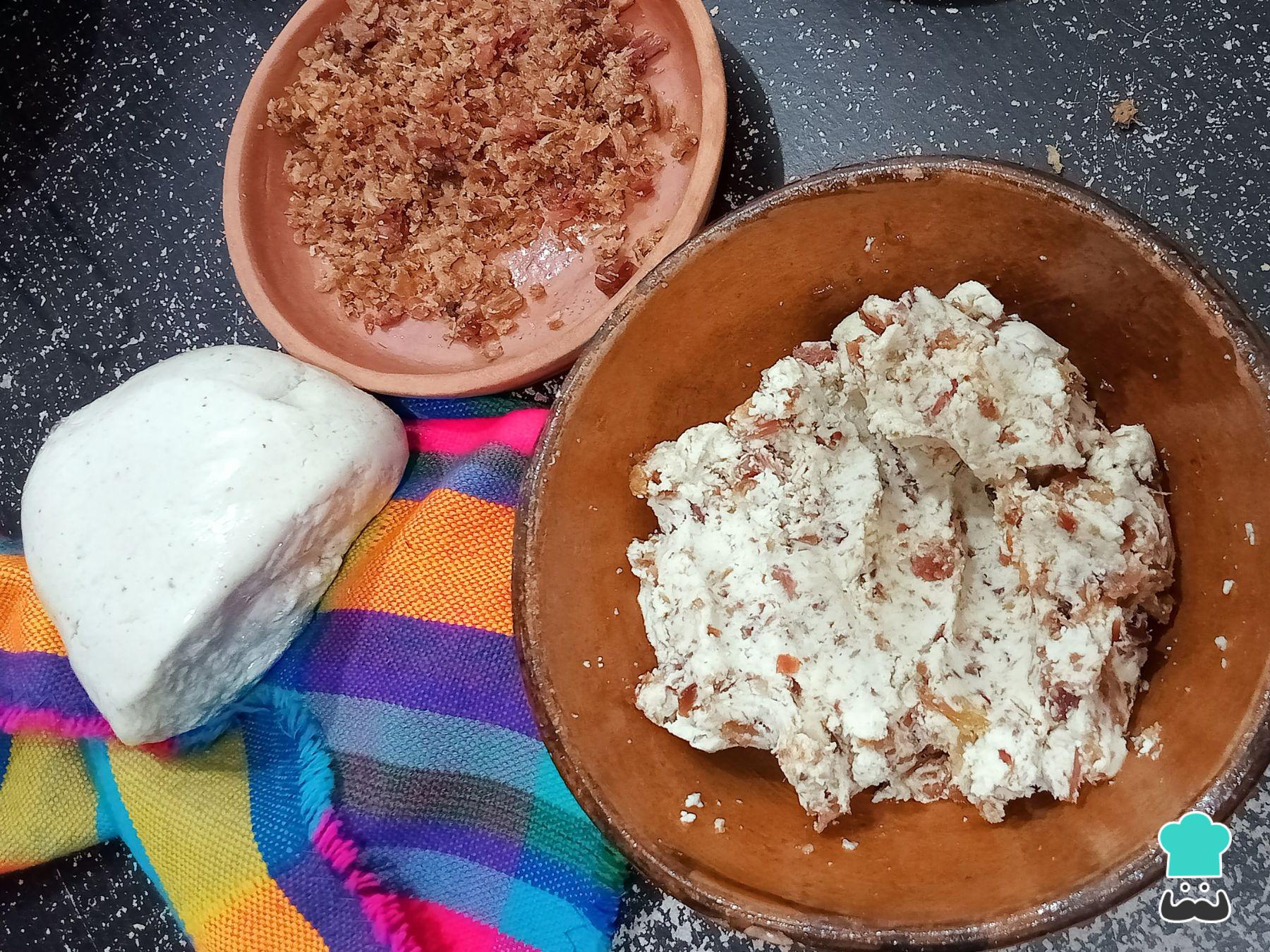 Para los chochoyotes: pela el ajo y machácalo. Incorpora el ajo a la masa de maíz junto con el chicharrón prensado, la sal y la manteca. Mezcla todo muy bien.