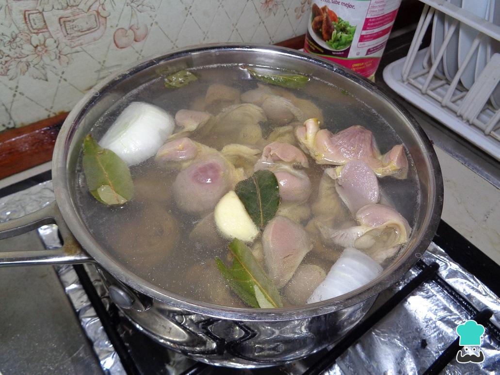 Una vez que tenemos todos los ingredientes listos, ¡ya podemos ponernos manos a la obra con la receta mexicana! Para ello, empezamos por la cocción de las mollejas de pollo, la cual puede resultar duradera. Cogemos una cacerola con suficiente agua y la ponemos a hervir, añadiendo un trozo de cebolla, un diente de ajo y las hojas de laurel. Cuando comience a hervir, añadimos las mollejas lavadas y dejamos que se cuezan a fuego alto por aproximadamente 30-40 minutos.