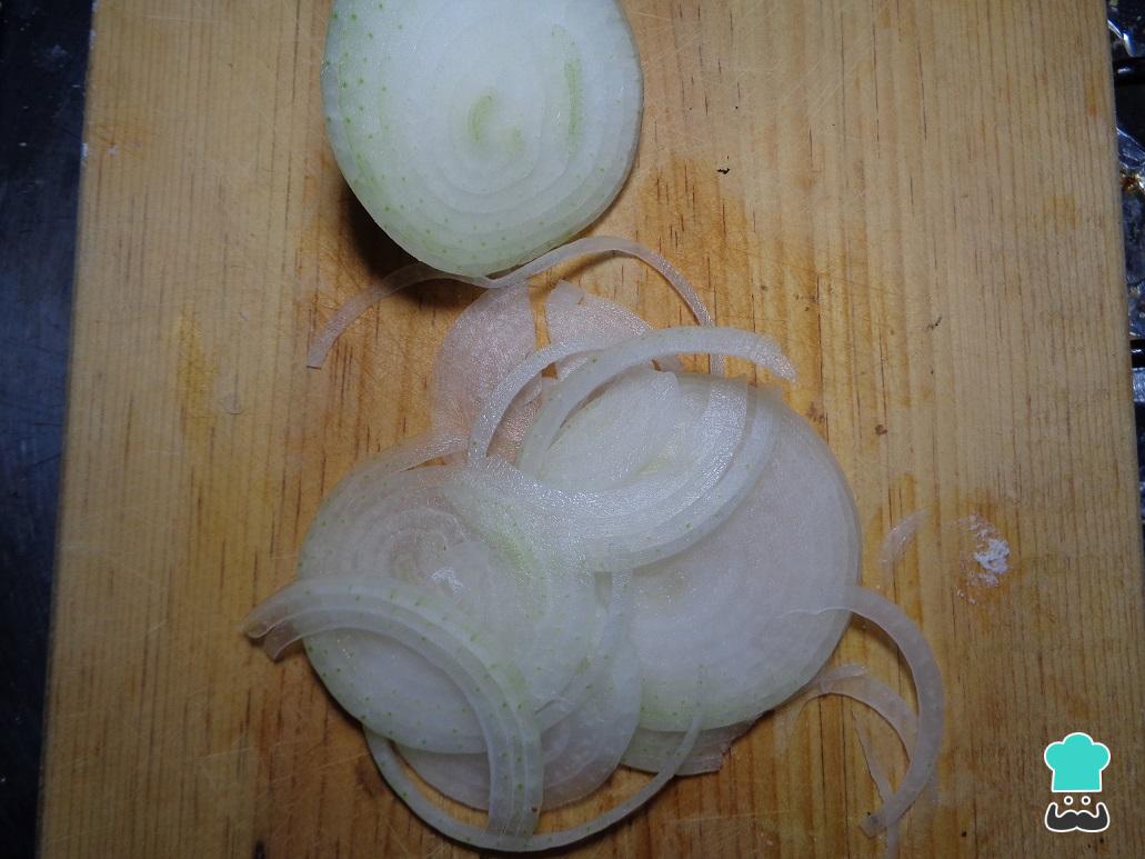 Durante los 25 minutos que dura la cocción anterior de las mollejas, podemos aprovechar para rebanar finamente las cebollas, tal y como se observa en la fotografía. Si consideramos que tres cebollas son poca cantidad para la elaboración de las mollejas de pollo encebolladas, siempre podemos añadir alguna más.
