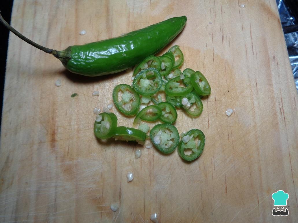 Por otro lado, para continuar con la preparación de los ingredientes de la receta de mollejas de pollo en salsa picante, tomamos los chiles serranos, los limpiamos bien y los comenzamos a rebanar muy finamente, como observamos en la siguiente imagen.
