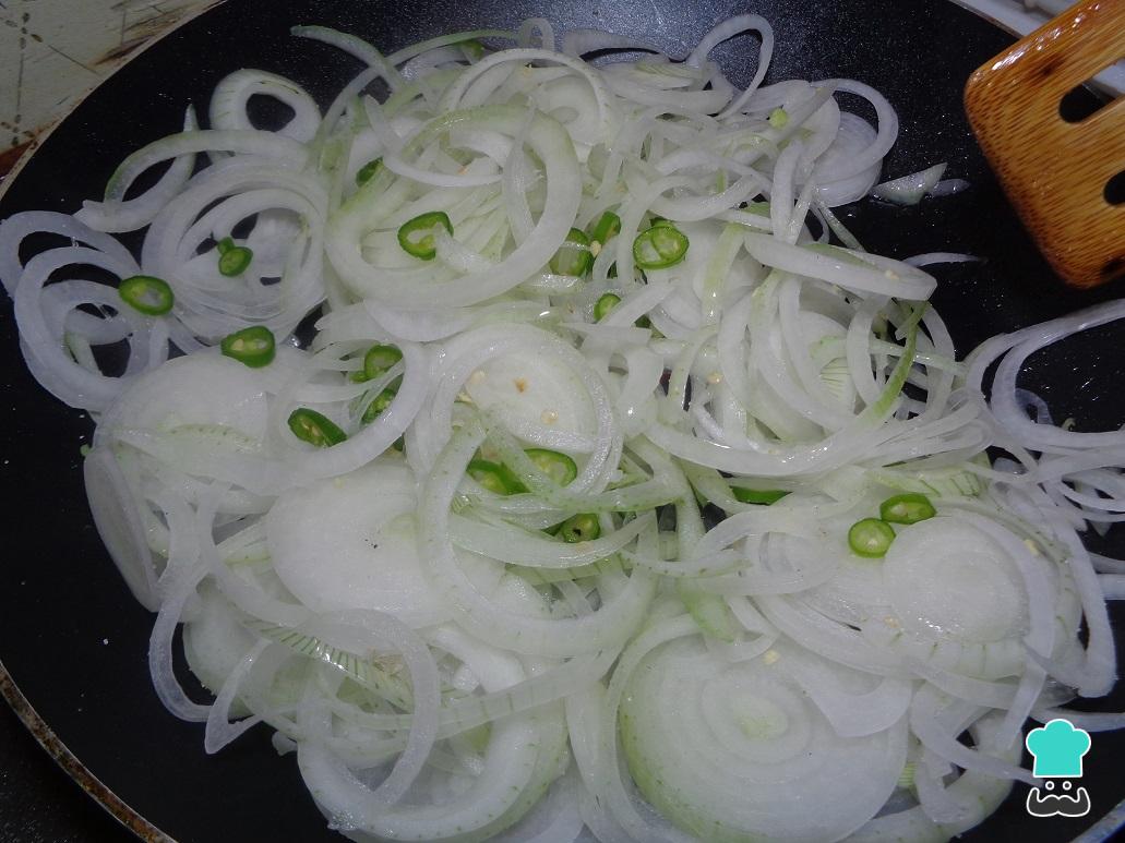 Cuando hayan transcurrido los 25 minutos de la cocción de las mollejas de pollo con cebolla, cogemos la cebolla y el chile serrano rebanados y los colocamos en una sartén con aceite caliente, añadimos una pizca de sal y pimienta y dejamos que se sofrían estos ingredientes por aproximadamente 5 minutos, moviéndolos constantemente para evitar que se quemen. Estará listo el sofrito cuando la cebolla se torne transparente.