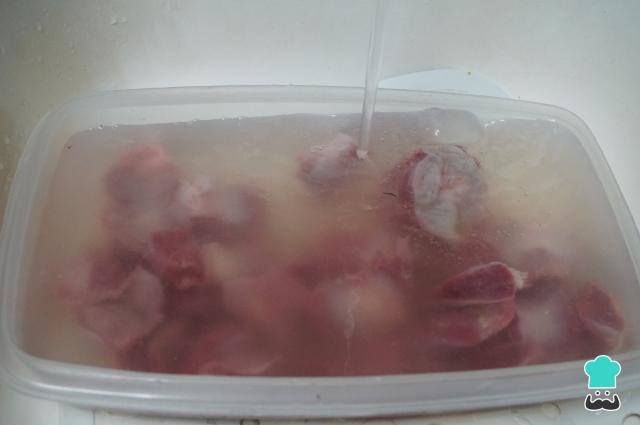 Pon las mollejas en un bol con agua bajo el grifo y límpialas bien quitando la piel, la grasa y la sangre.