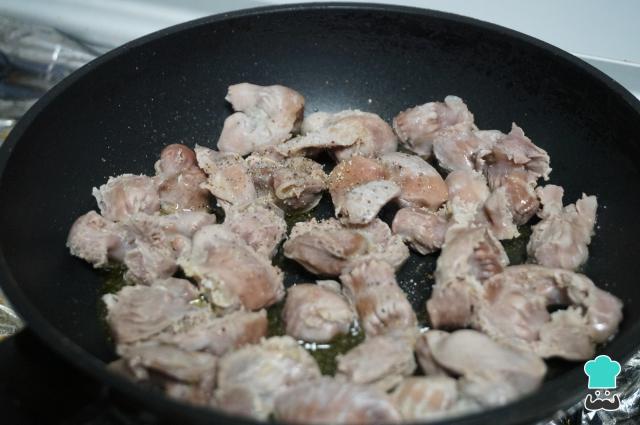 Pon una sartén con un buen chorro de aceite, sala y añade un poco de pimienta. Corta las mollejas de pollo en trozos pequeños y añádelas a la sartén. Saltéalas para que se doren por todos los lados y mantenlas a fuego medio durante 10 minutos o hasta que estén un poco doradas.