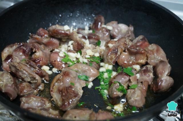 Añade el ajo y el perejil picado, ve removiendo para que se mezcle todo bien y para que las mollejas de pollo vayan cogiendo el sabor del ajo. Ten cuidado de que el ajo no se queme. Cuando esté, saca y sirve tus mollejas de pollo fritas calientes. Si te gusta el picante, puedes añadir una guindilla o una cayena junto con los ajos y el perejil.