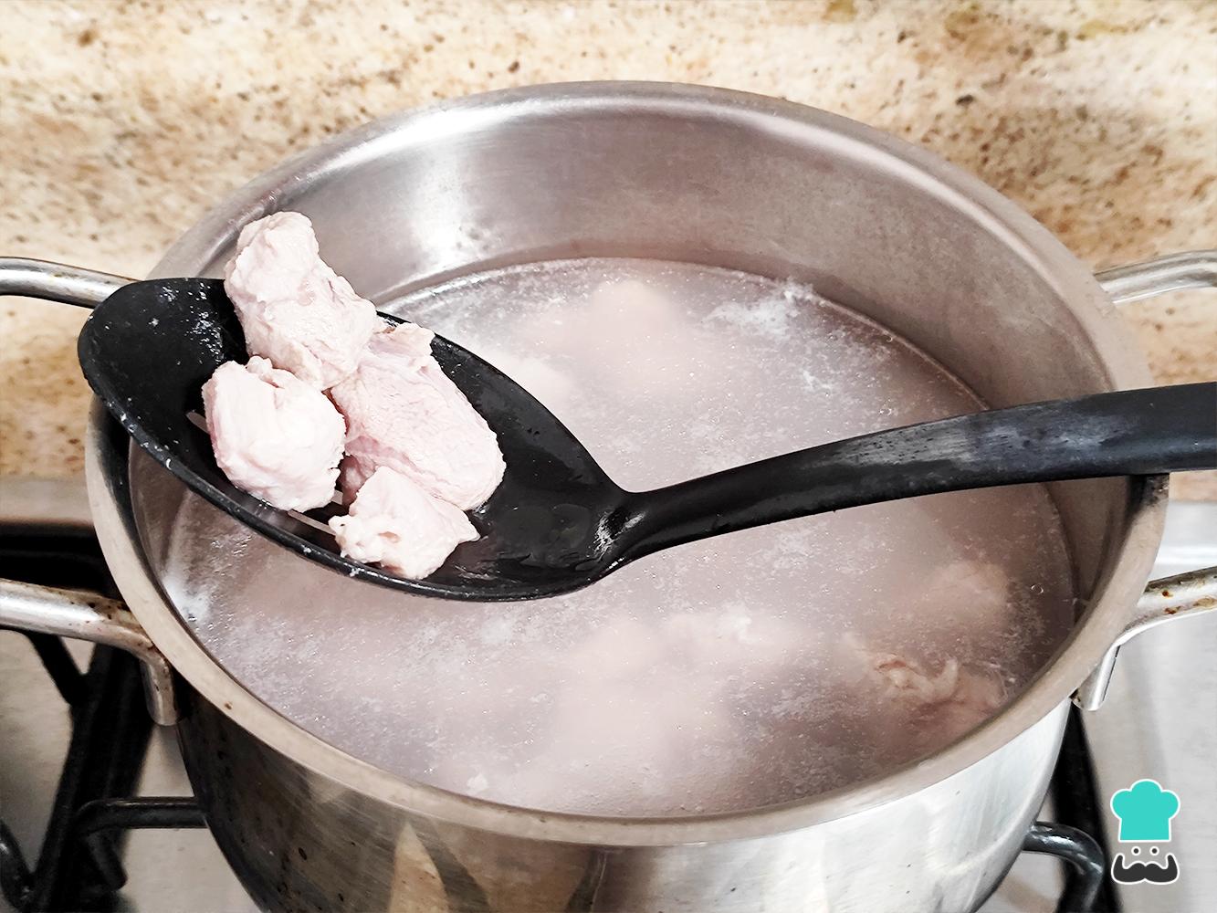 Para empezar, cuece la carne en una olla con suficiente agua. Cocina la carne con sal hasta que esté suave, luego escúrrela y resérvala.