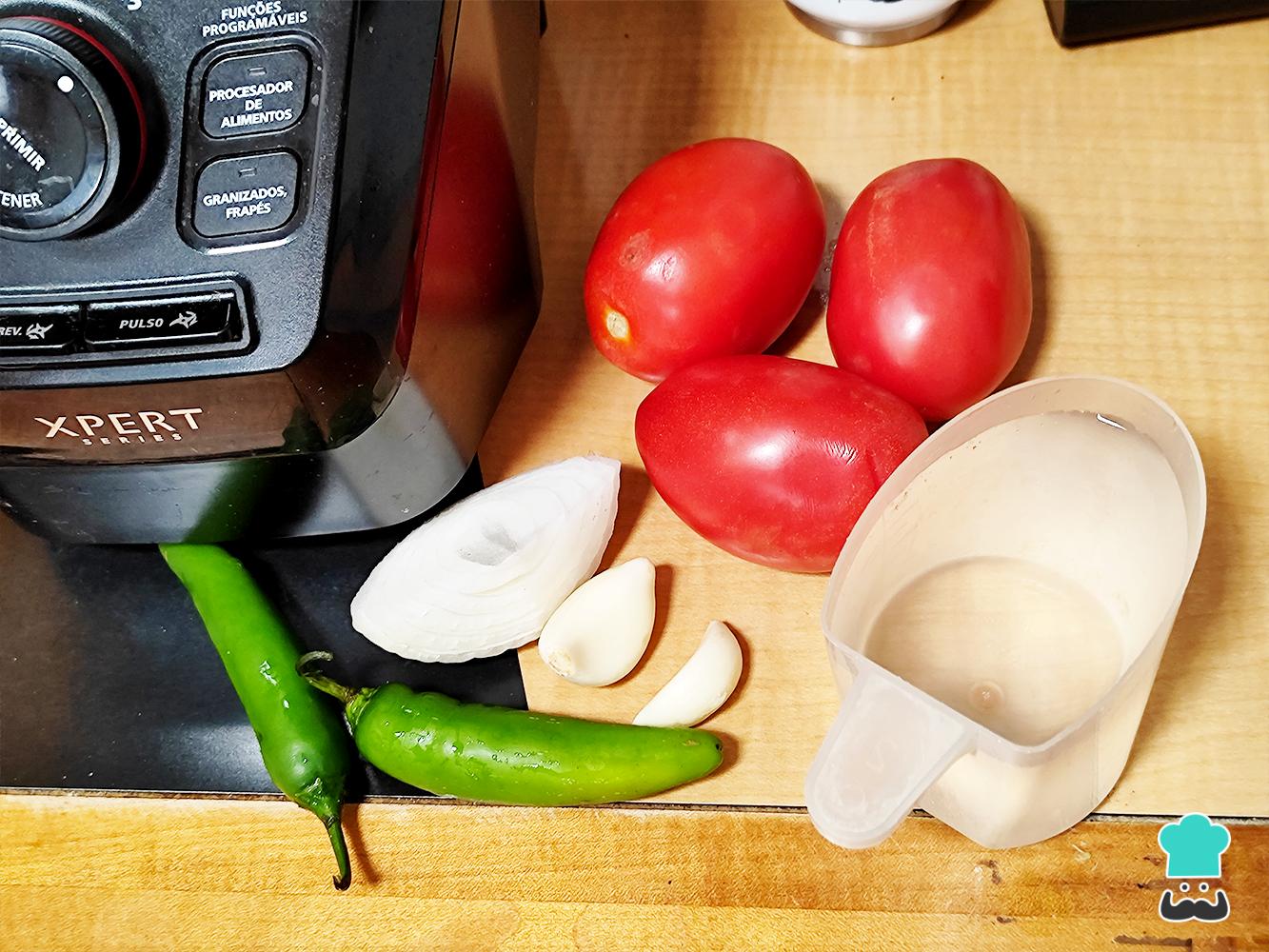 Prepara la salsa. Para ello, licúa los jitomates, los chiles, el ajo y la cebolla con un poco de agua hasta obtener una salsa uniforme.