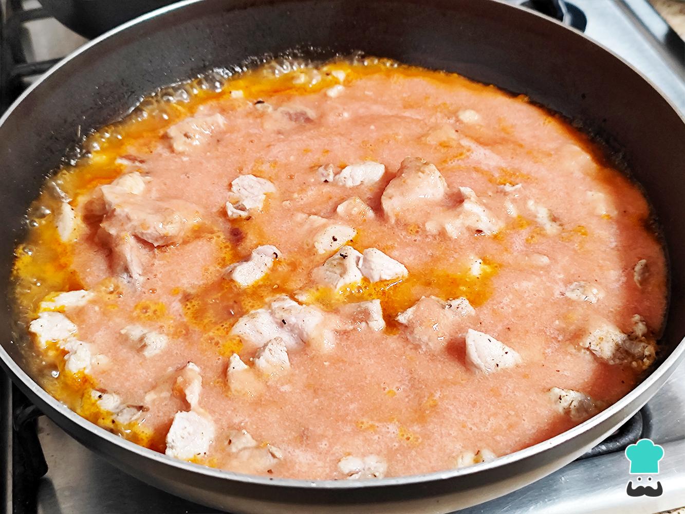 Cuando la carne esté un poco dorada, vierte la salsa licuada y deja hervir por 10 minutos. Rectifica la sazón y, si lo ves necesario, añade un poco más de sal y pimienta al gusto.