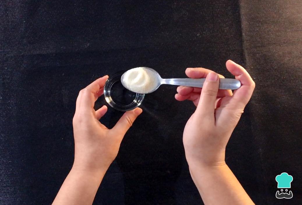 Llena un vasito pequeño con agua para hidratar la gelatina. Echa la gelatina en polvo en él y caliéntala en el microondas. Déjala por 15 segundos, sácala y mézclala con la cucharita para que se integre. Repite el proceso 2 o 3 veces hasta que la gelatina esté lista. Si tienes dudas en este paso, te invitamos a visitar nuestro artículo Cómo hidratar la gelatina.