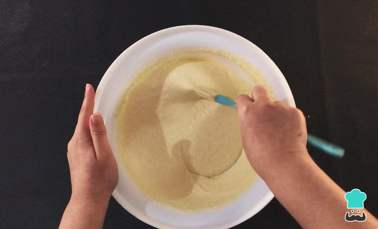 Añade la mezcla de mango, gelatina y azúcar al bol donde tienes la nata montada. Mezcla con movimientos suaves y envolventes hasta que te quede una crema de color amarillo pálido.