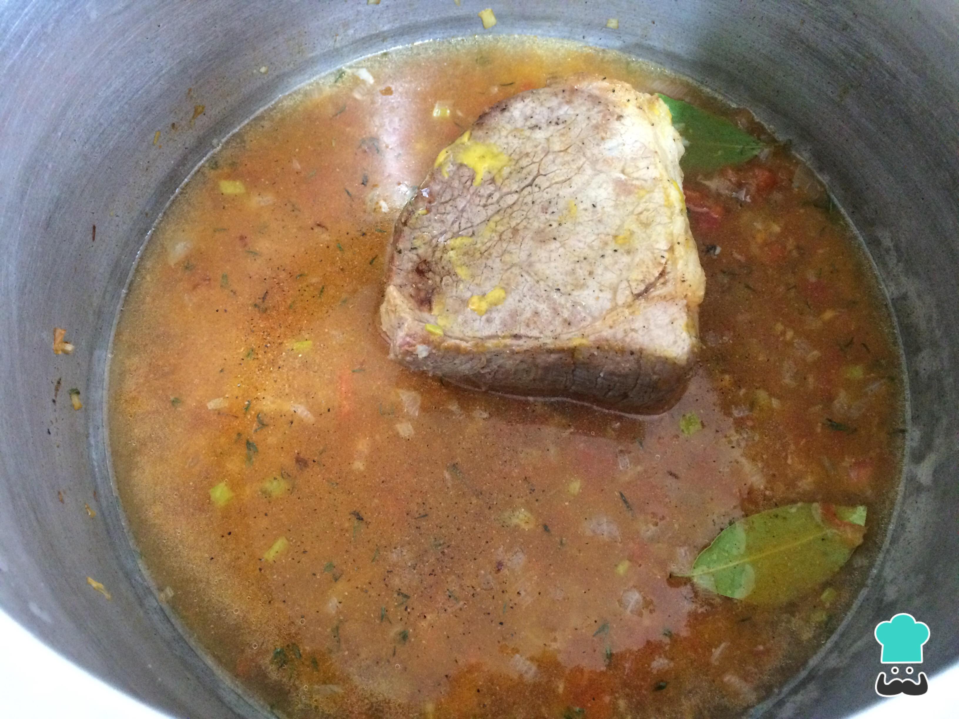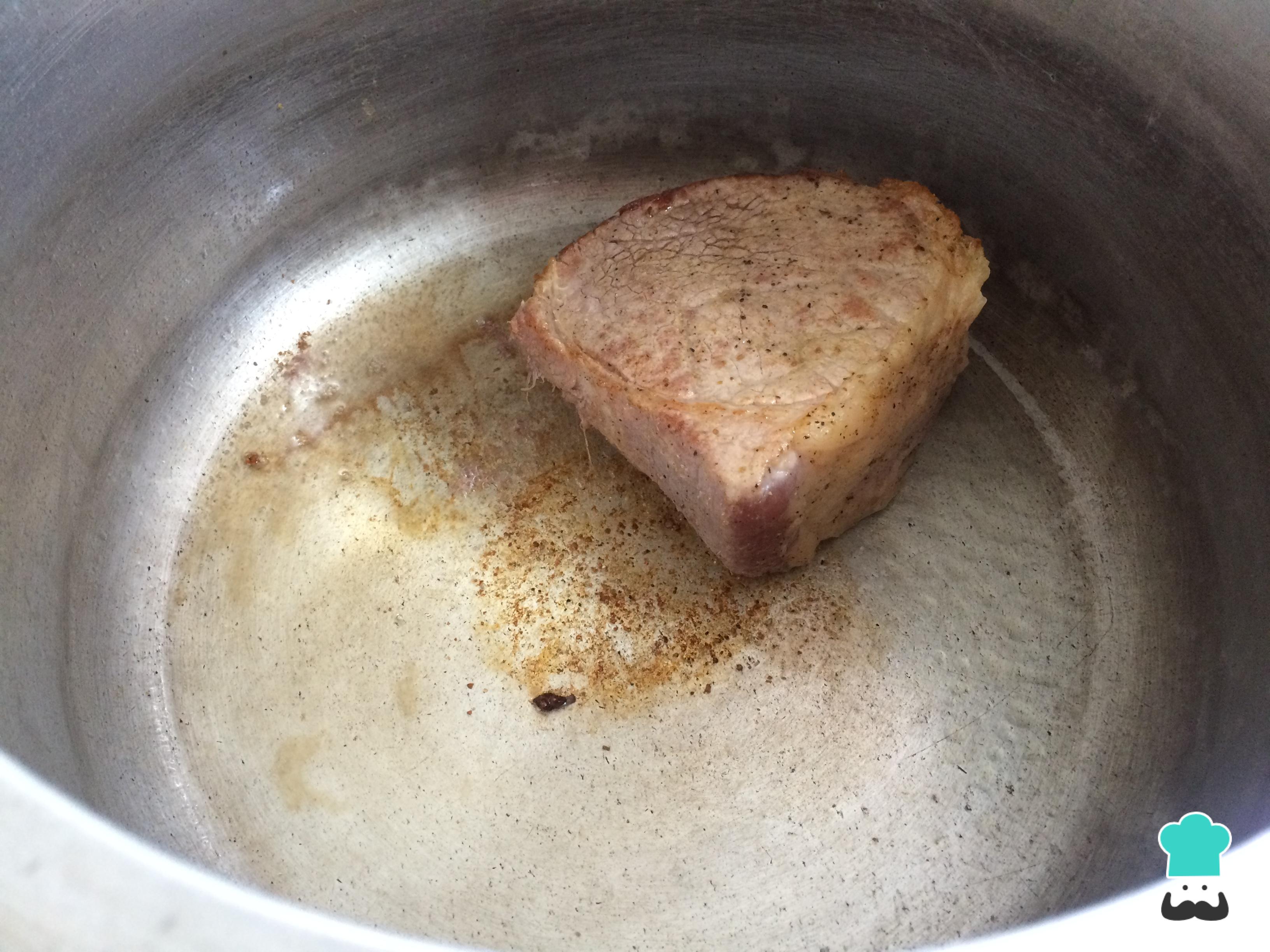 En una olla a presión con aceite, sella el muchacho, previamente aderezado con sal, pimienta y comino.