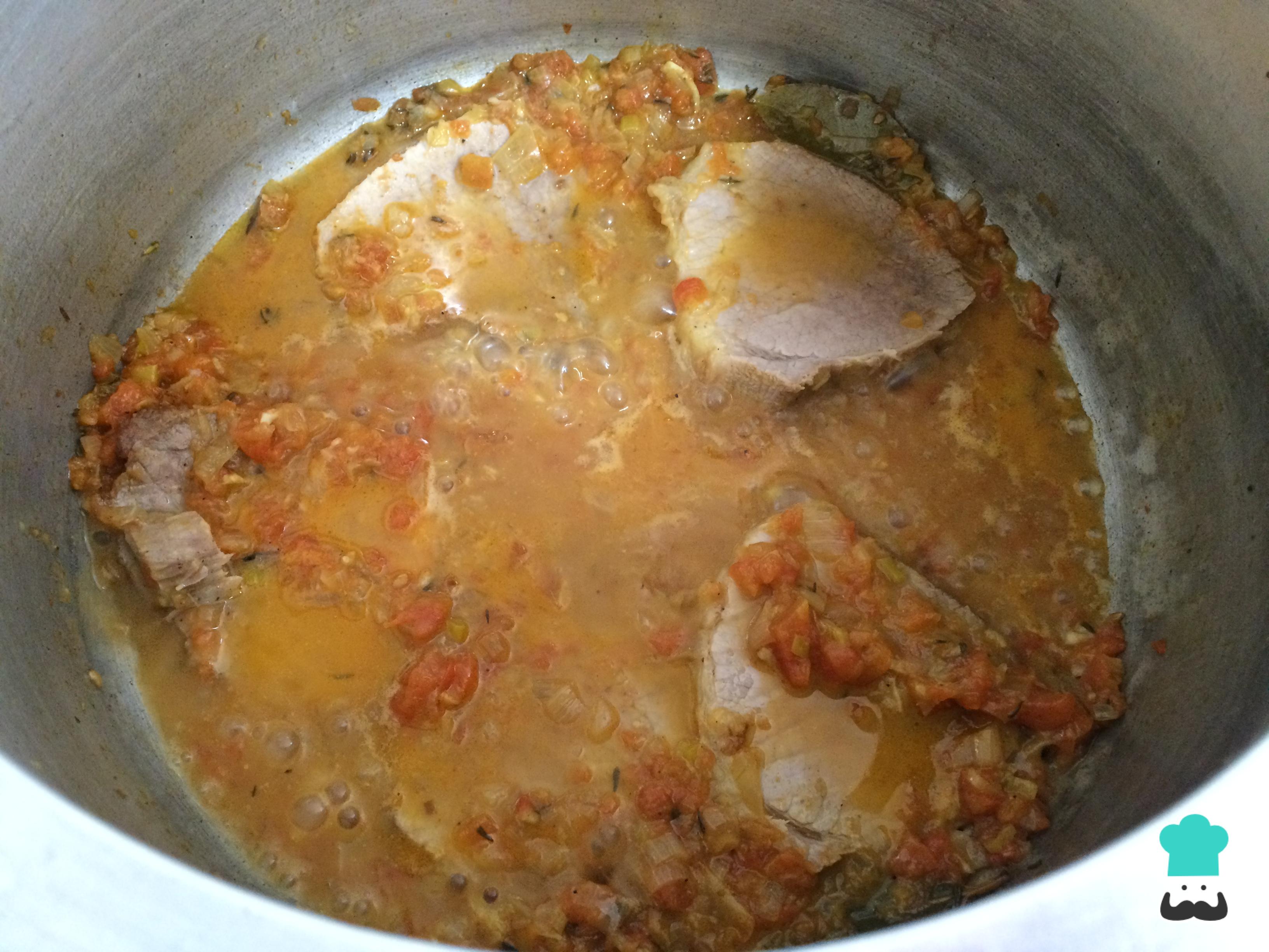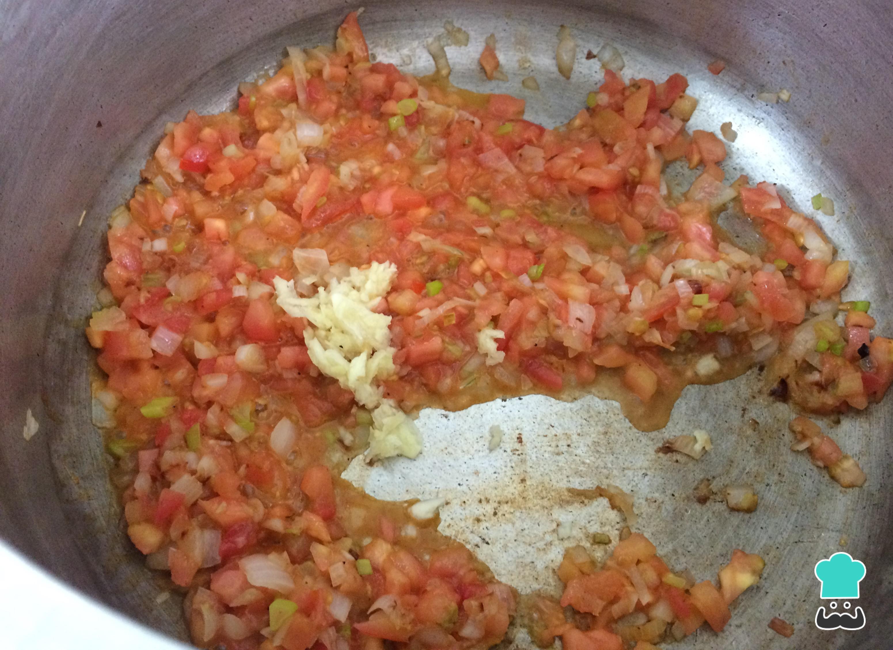Retira la carne y añade un poco más de aceite, agrega las cebollas finamente picadas y deja sofreír. Cuando estén blandas añade el tomate pelado y el ajo picado finamente, cocina a fuego bajo hasta que el tomate suelte sus jugos.