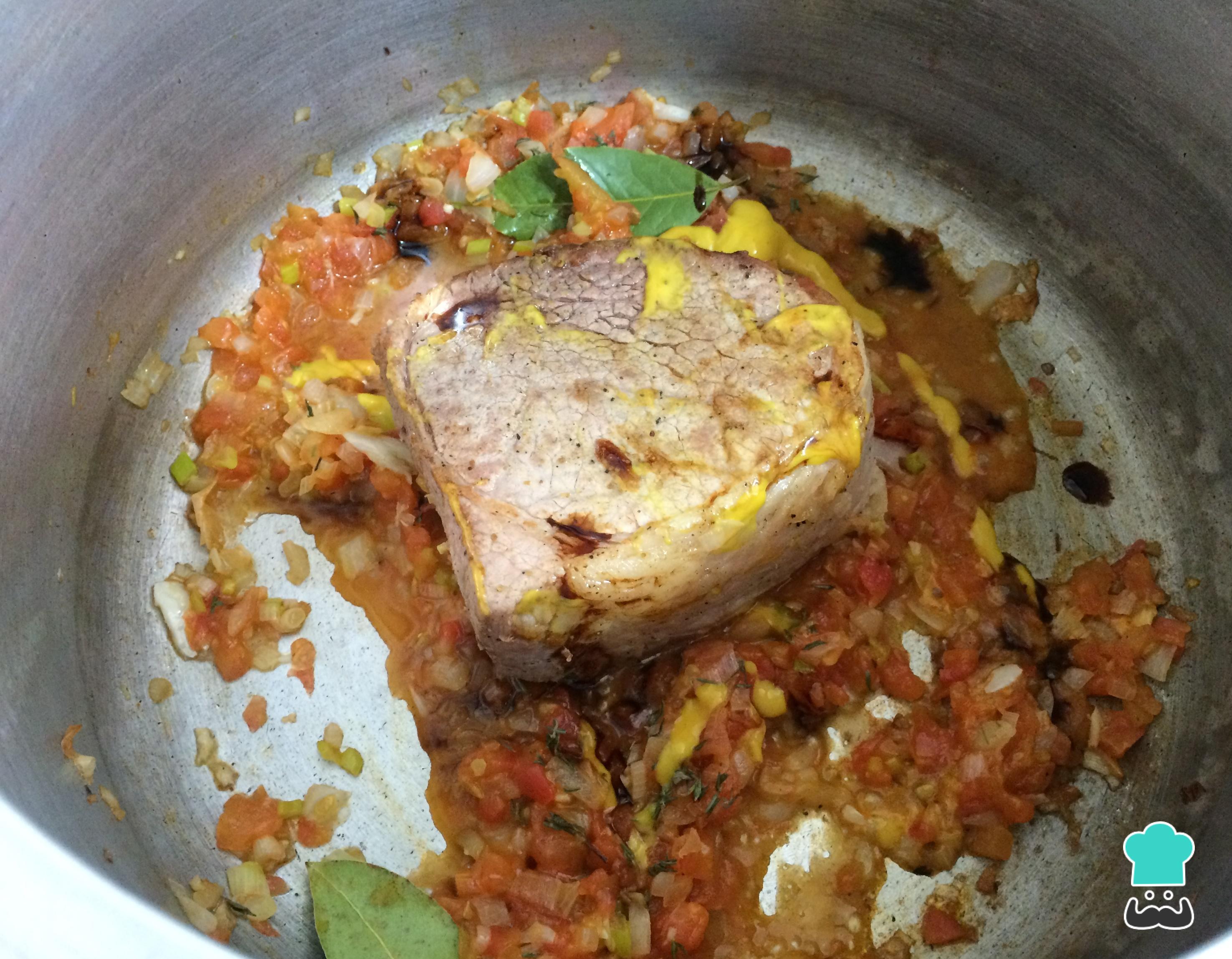 Es momento de añadir de nuevo el muchacho, agregar la salsa inglesa, la mostaza, las hojas de laurel y mezclar todo muy bien.