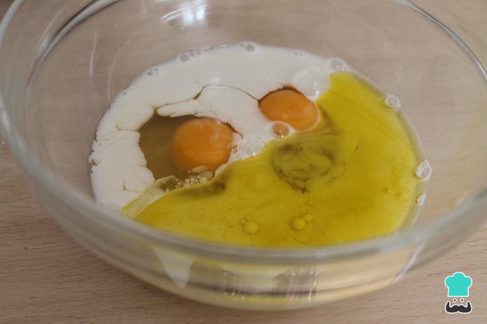 Pon en otro bol los huevos junto con la leche y el aceite, y mezcla hasta obtener una pasta lisa. También puedes utilizar otro tipo de leche sin lactosa, como la leche de soja, la leche de avena...