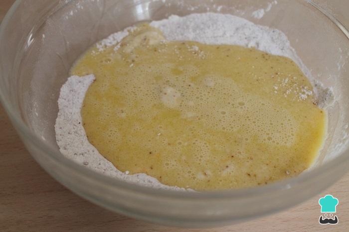 Vierte los huevos junto con la leche y el aceite encima de la harina e integra.
