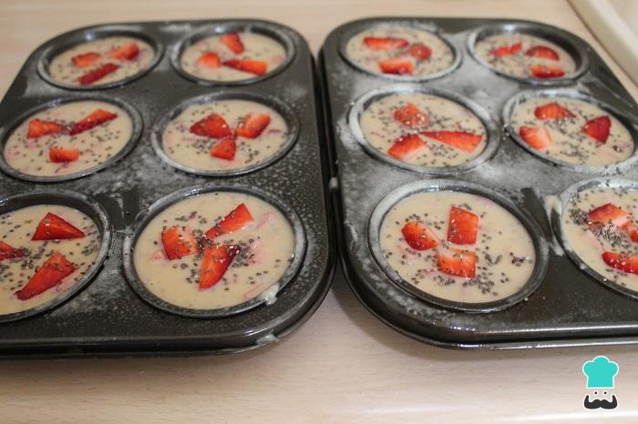 Escurre las semillas de chía en un escurridor y agrégalas a la mezcla anterior. Incorpora también las fresas troceadas (reserva unos cuantos trozos para decorar los muffins) y mezcla.