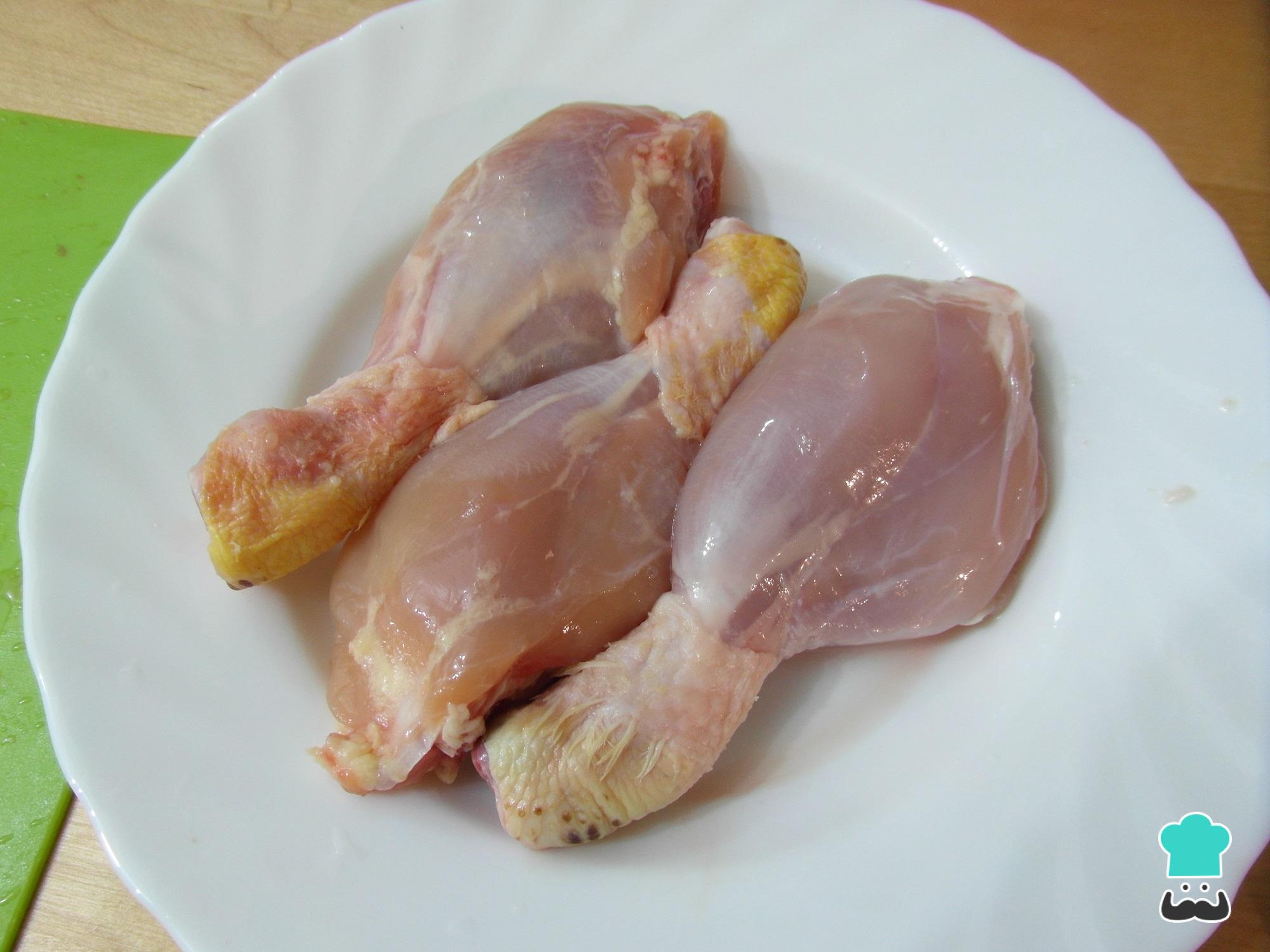 Elimina la piel de los muslos de pollo. Hacemos esto para reducir la cantidad de calorías y grasa en esta receta de pollo al limón al horno y también, para que los condimentos penetren mejor en la carne.