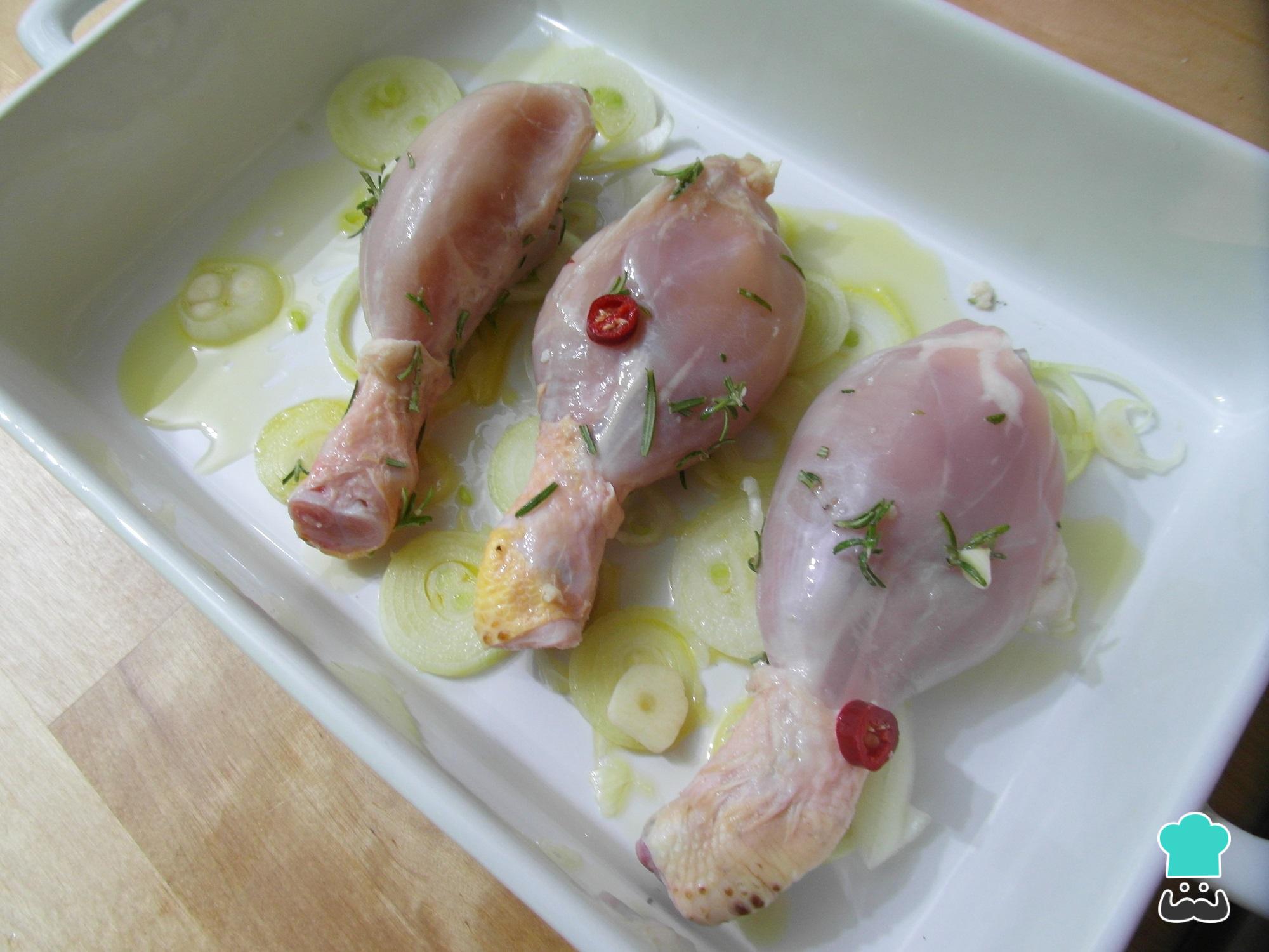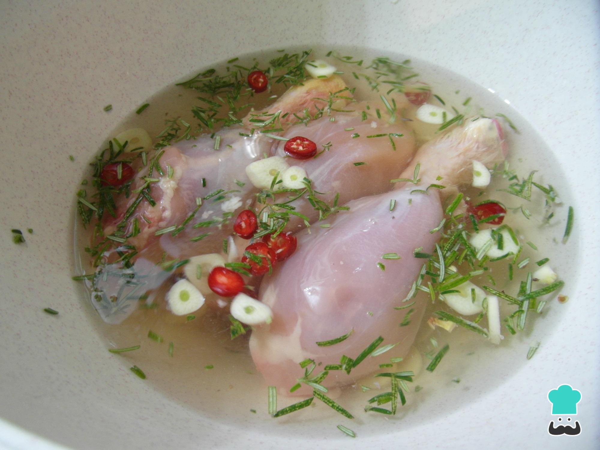 Corta en rebanadas los ajos y los chiles y pica las hojas del romero. Ponlos en un tazón junto con el vino y los muslos de pollo y deja marinarlos en el refrigerador durante 1-2 horas.