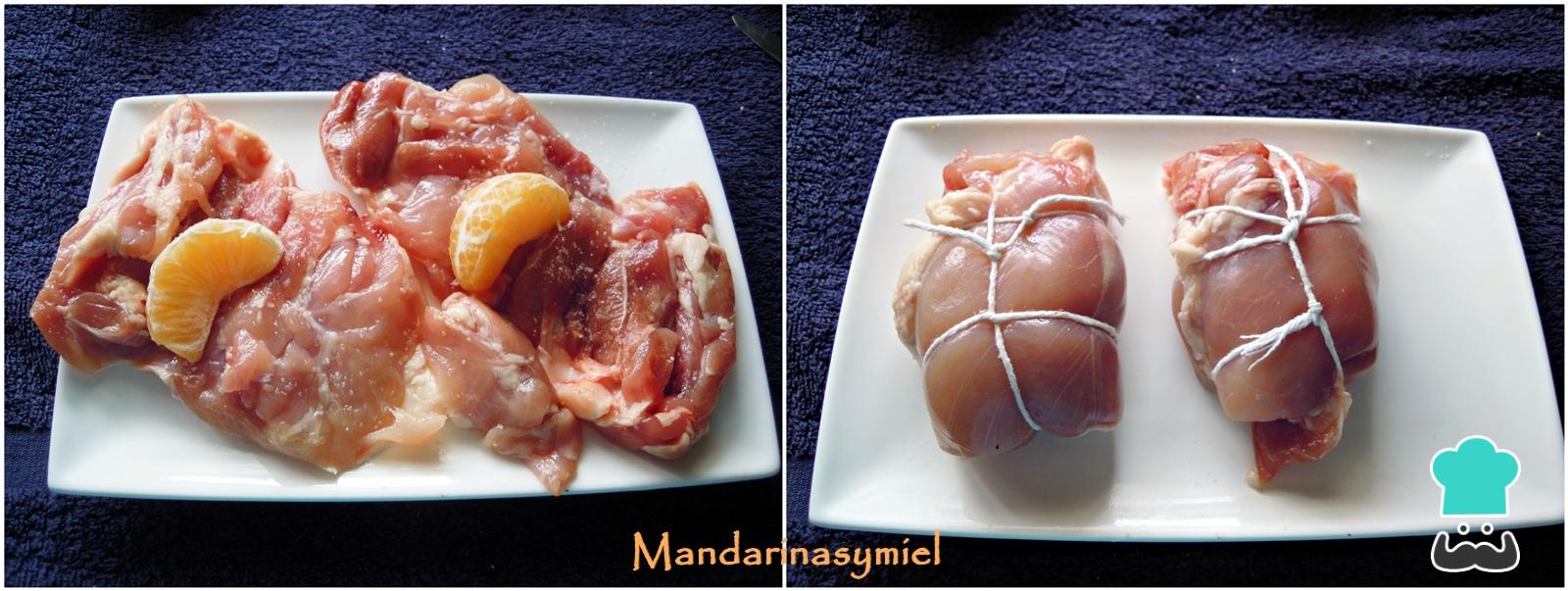 Pon en el centro de los contramuslos un gajo de mandarina y sazona por dentro y por fuera. Forma los rollitos y ata la carne con hilo bramante para que no se abran.