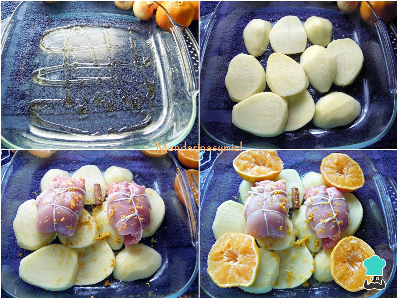 Pon un chorrito de aceite sobre una fuente de horno, añade las patatas cortadas y coloca encima los muslos de pollo rellenos. Ralla dos mandarinas, pártelas por la mitad y saca su zumo. Espolvorea la ralladura de las mandarinas por encima del pollo y de las patatas, añade el zumo y un trozo de canela. Coloca las medias mandarinas por los lados de la fuente para potenciar el sabor de la receta.