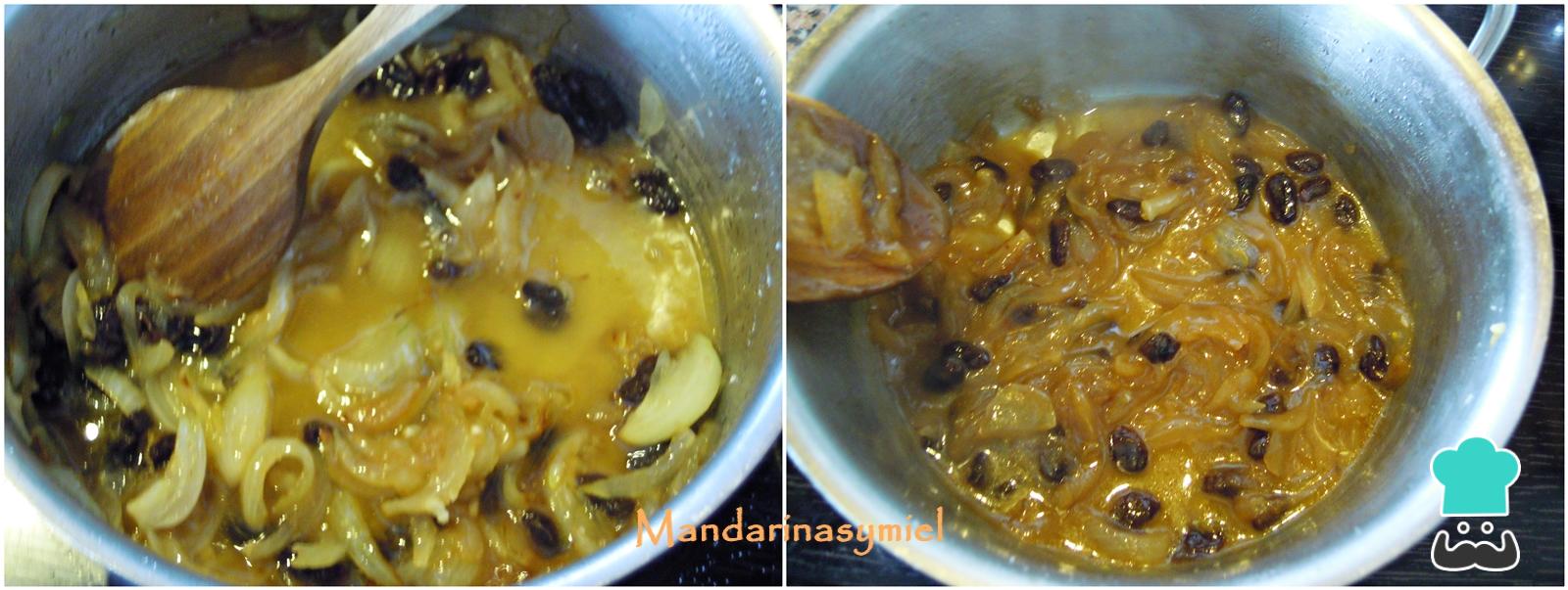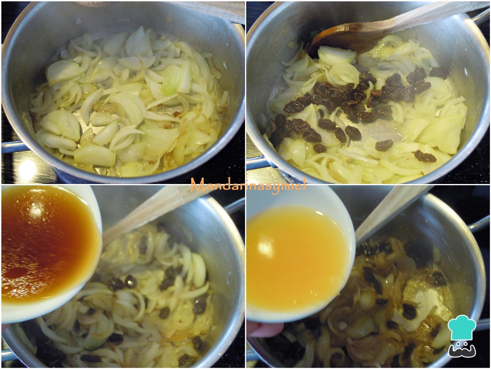 para la salsa, pon aceite en una sartén o cazuela y sofríe la cebolla a fuego lento. Cuando esté casi hecha, añade las pasas remojadas y una cucharadita de harina, remueve bien. Añade el moscatel y el zumo de las mandarinas que quedan, y deja que se reduzca a fuego lento removiendo de vez en cuando hasta que haya espesado.