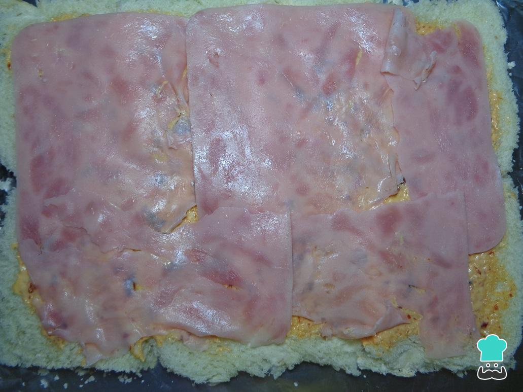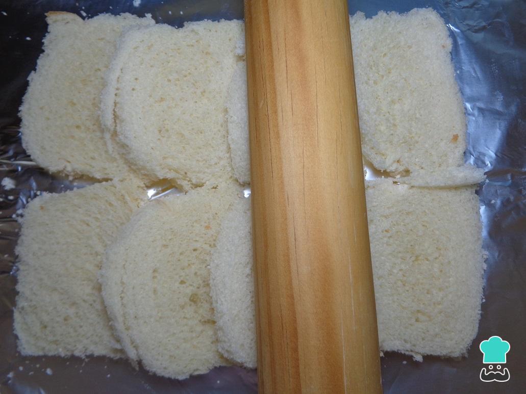 Empezamos la preparación colocando una lámina de papel de aluminio sobre una superficie plana y lisa. Sobre el papel, disponemos las rebanas de pan blanco en dos o tres filas y, con ayuda de un rodillo, las aplanamos completamente.