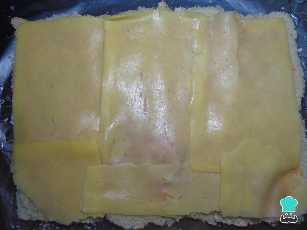 Sobre el jamón, disponemos las rebanadas de queso manchego. Si lo prefieres, puedes sustituir este tipo de queso por otro que sea de tu preferencia para adaptar a tu gustos la receta de niño envuelto.
