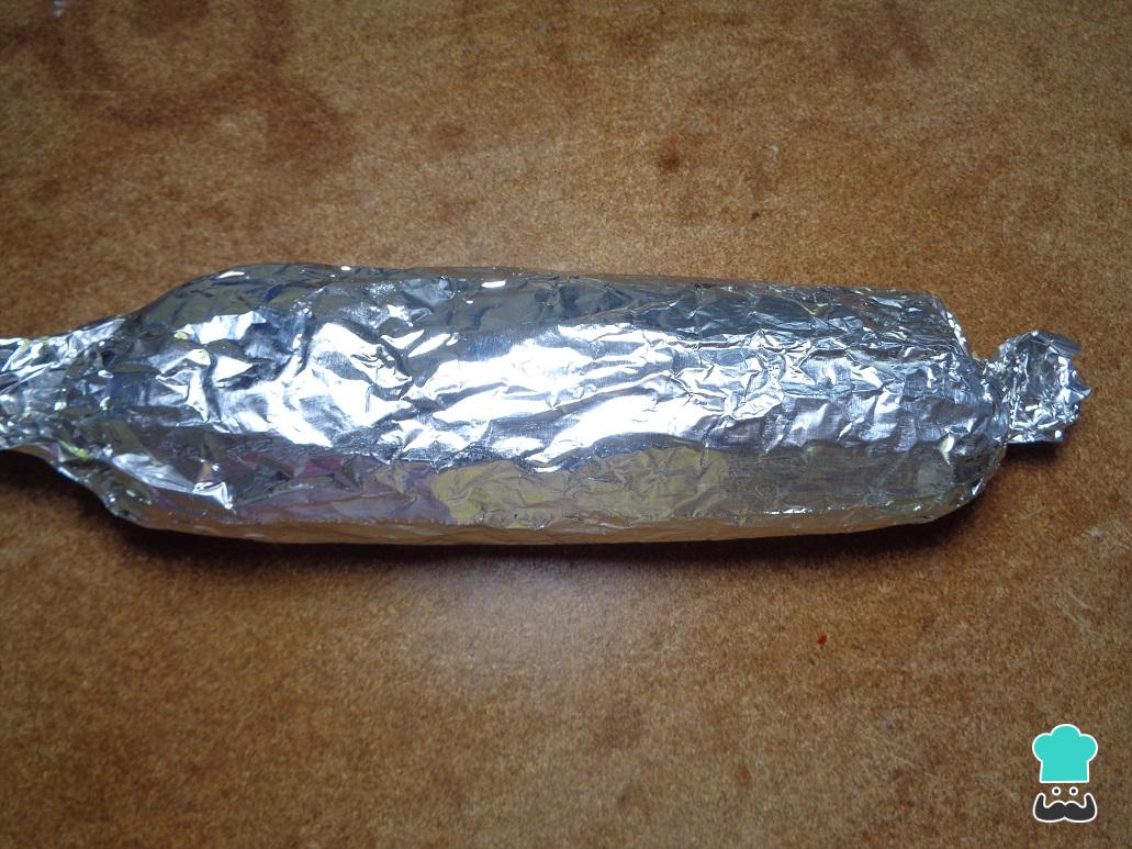 Ahora, con ayuda del papel de aluminio, enrollamos el pan ejerciendo una leve presión para que el rollito quede bien sujeto. Dejamos el niño envuelto con el papel, sellando los bordes, y lo reservamos en el frigorífico durante 15 minutos como mínimo.