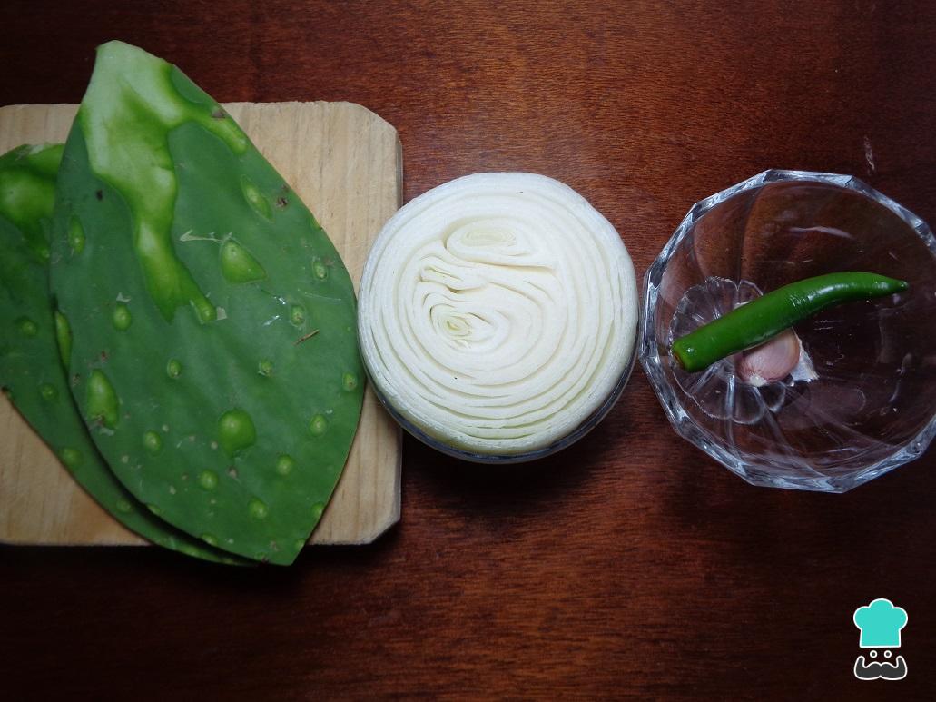 En la siguiente imagen podrás observar los ingredientes que necesitaremos para la preparación de estos deliciosos nopales guisados con cebolla.