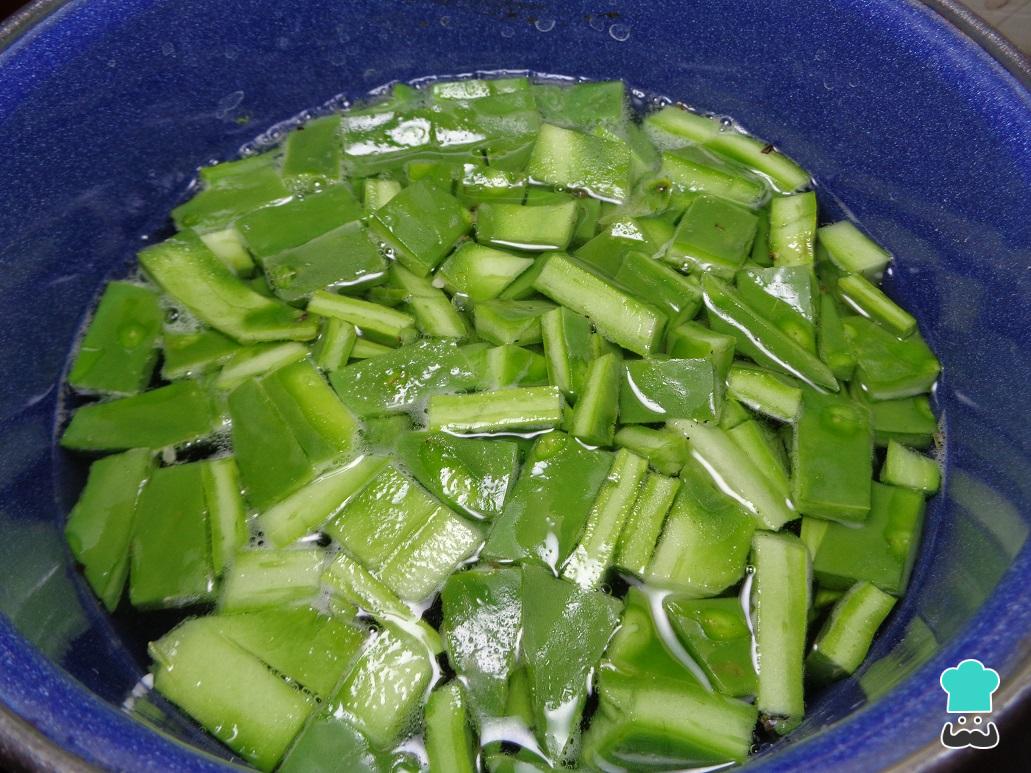 Vamos a comenzar por cocinar los nopales. Para esto antes debemos picarlos finamente en pequeños rectángulos, colocarlos en una cacerola con agua hirviendo y dejar que se hagan junto con el ajo, un trocito de la cebolla, una pizca de sal y la cucharada de bicarbonato de sodio.