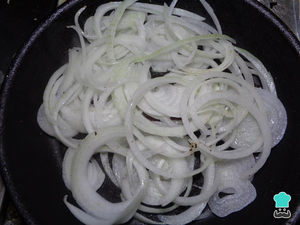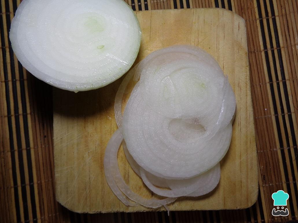 Como en otros platos encebollados, como la receta de hígado encebollado, es mucho mejor cortar la cebolla en aros o juliana muy fina.
