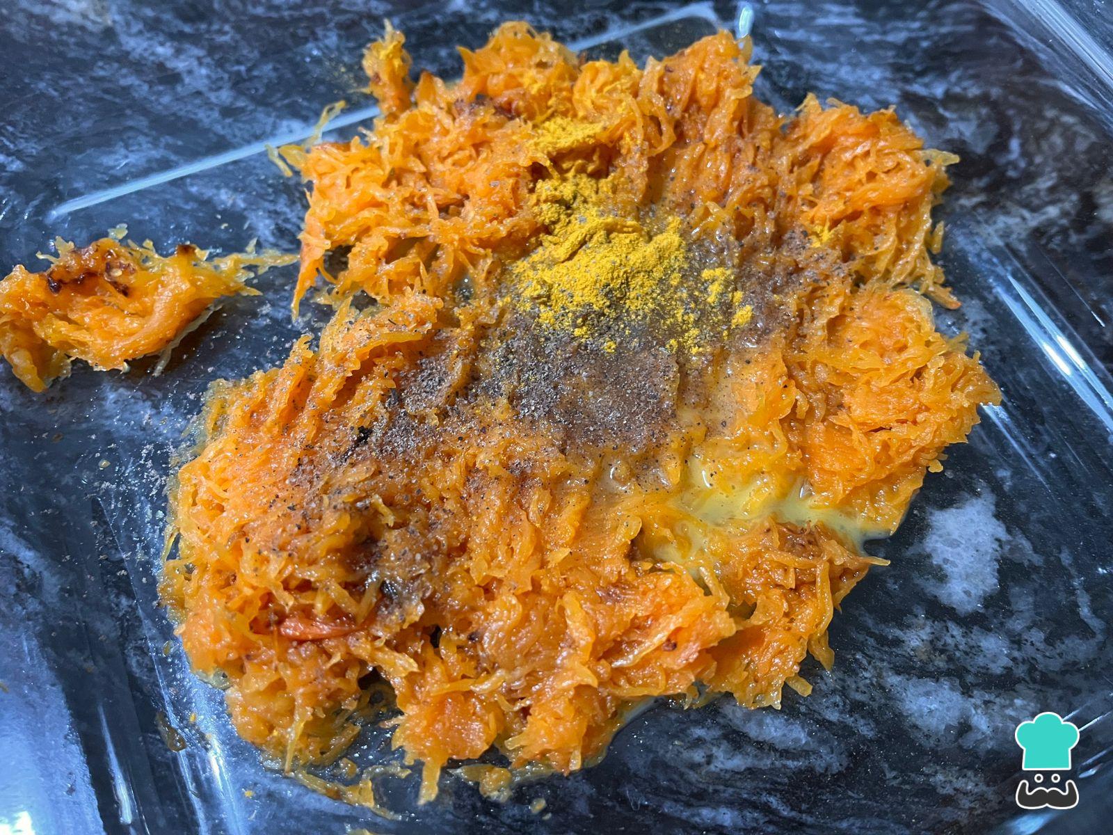 Pisa la calabaza para hacerla un puré y condimenta a gusto con nuez moscada, pimienta, cúrcuma, ajo en polvo. También puedes agregar un rollito de manteca. Si cocinas para alguien con celiaquía ten en cuenta que todos los productos, incluyendo condimentos, tengan el logo de apto.