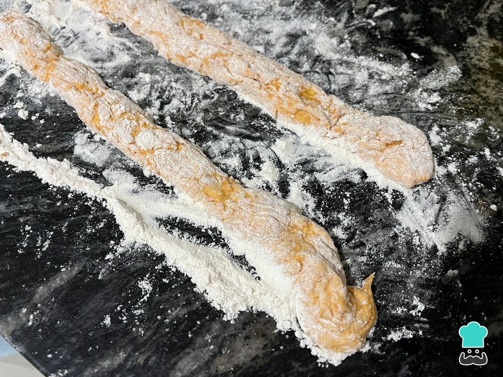 En la mesada limpia y enharinada o con maizena, haz rollitos para cortar tus ñoquis de calabaza y maizena. Asegúrate que te queden de tamaño similar para una cocción pareja.