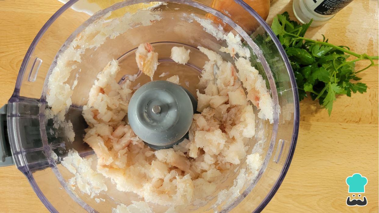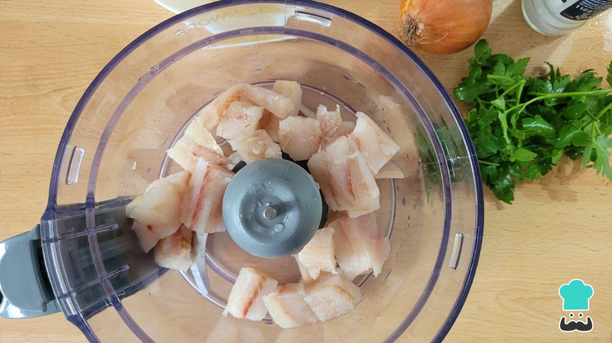 Coloca el pescado en una procesadora. Si el pescado está congelado, puedes cortarlo en cubos antes de descongelarlo por completo, pero deja descongelar antes de mezclarlo en el procesador de alimentos.