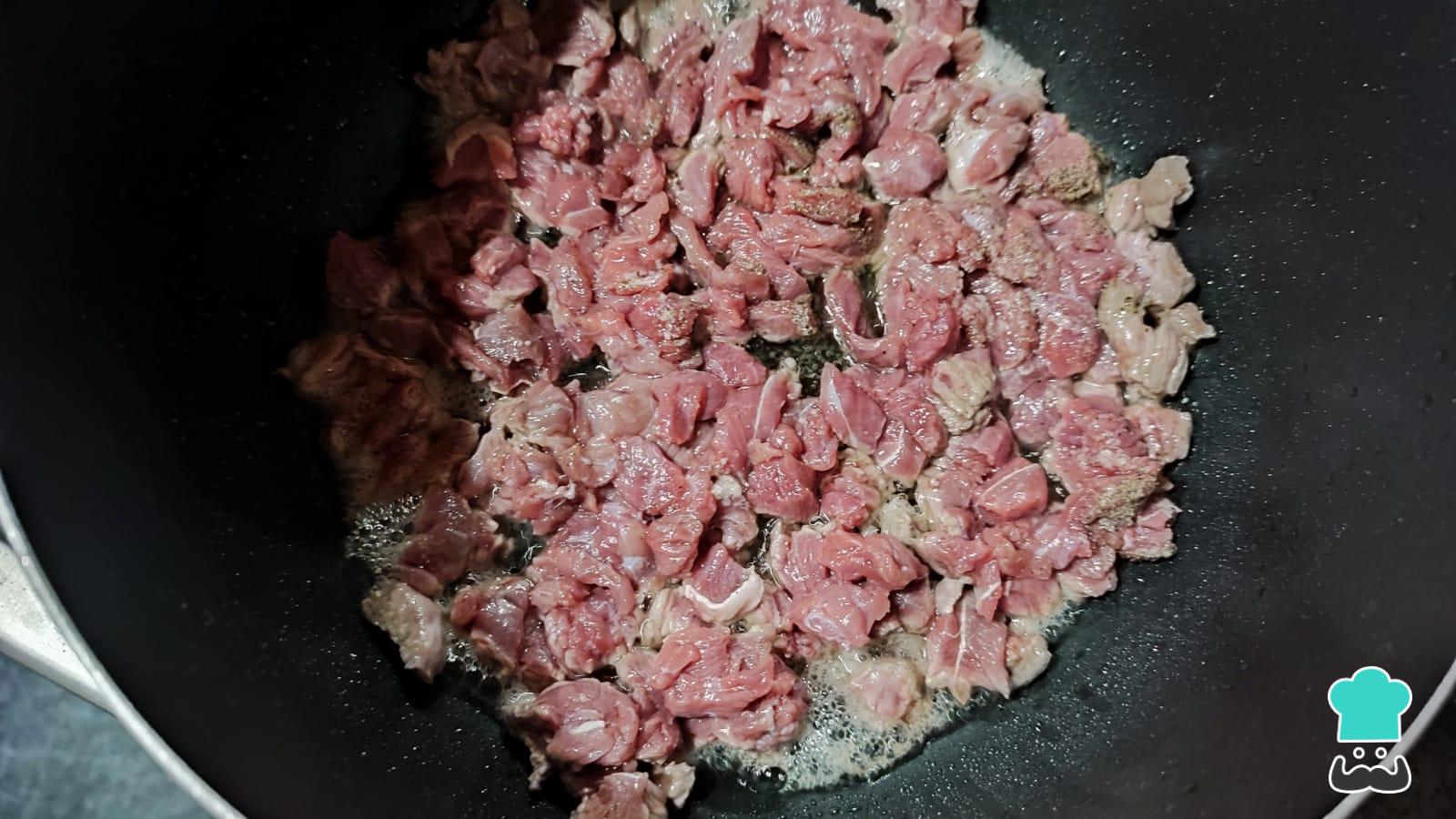 Calienta el aceite en una olla y cuando ya esté bien caliente, deposita allí la carne de res previamente picada y salpimentada.