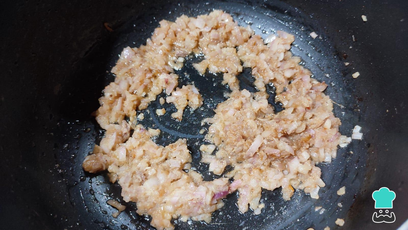 Retira la carne y reserva. En el mismo aceite de cocción de la carne, echa ahora la cebolla y deja cocinar por unos 3 minutos. Añade luego el ajo molido y cocina por unos 2 minutos más.
