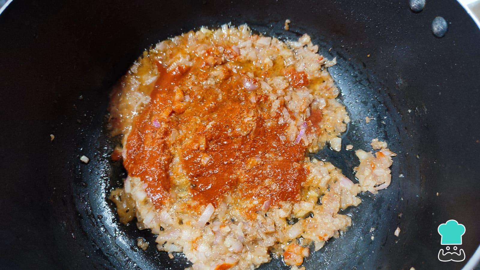 Agrega ahora la pasta de ají a fuego bajo y deja sofreír hasta que se haya cocinado completamente.