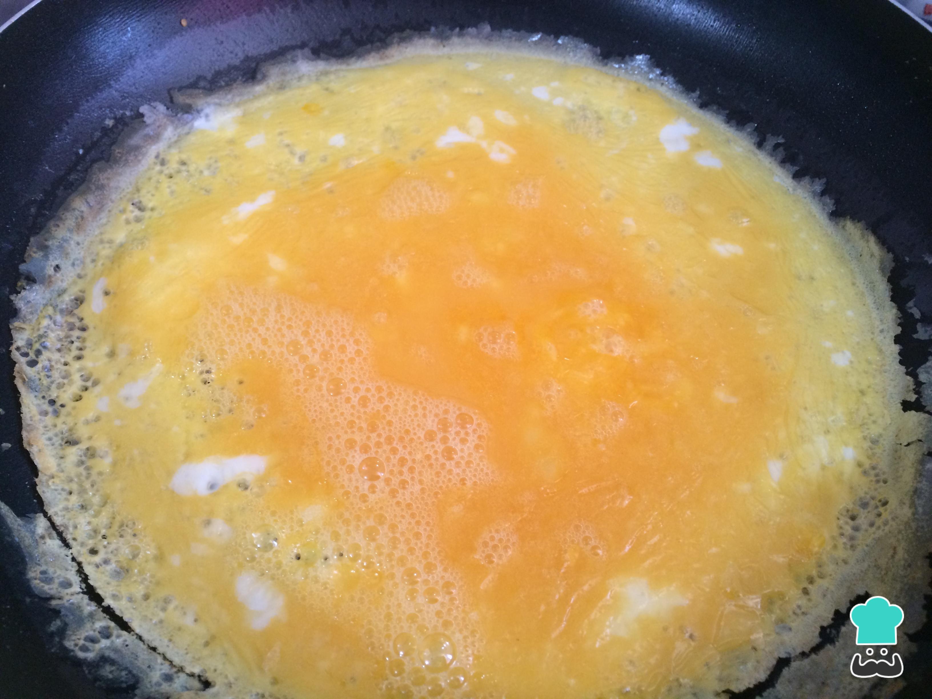 Aparte en una sartén con mantequilla, agregar los huevos batidos y salpimentados. Esparcir muy bien y cocinar hasta que el huevo esté un poco duro.