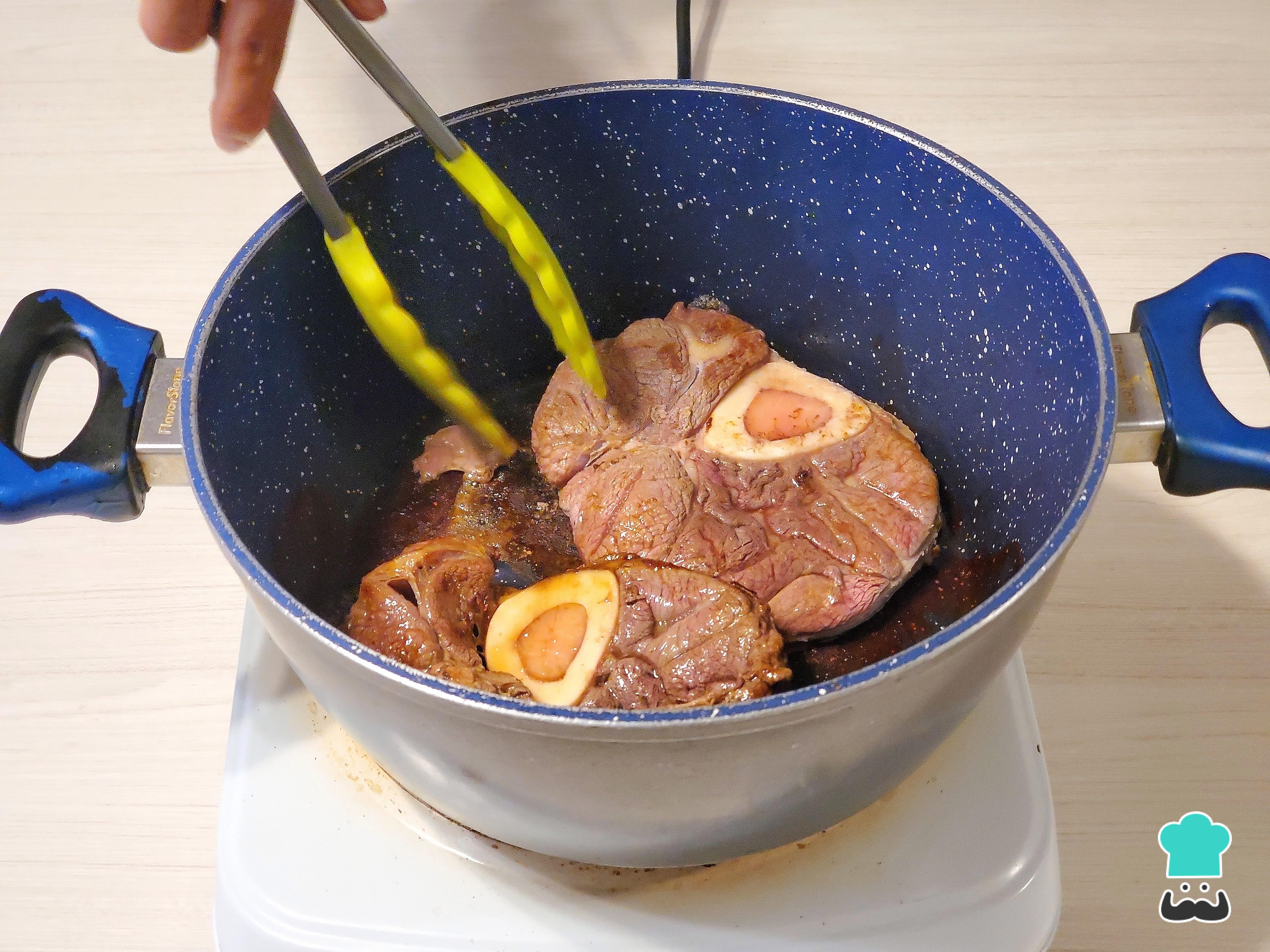 Aparte, en una olla grande, sella las piezas de osobuco salpimentadas. Para hacerlo, calienta una olla grande a fuego alto y vierte un buen chorro de aceite. Cuando esté caliente, coloca uno a uno los medallones de osobuco y deja que se doren por ambos lados, luego resérvalos. Para evitar que las piezas de carne se enrollen durante la cocción, realiza unas incisiones en las membranas que recubran el borde.