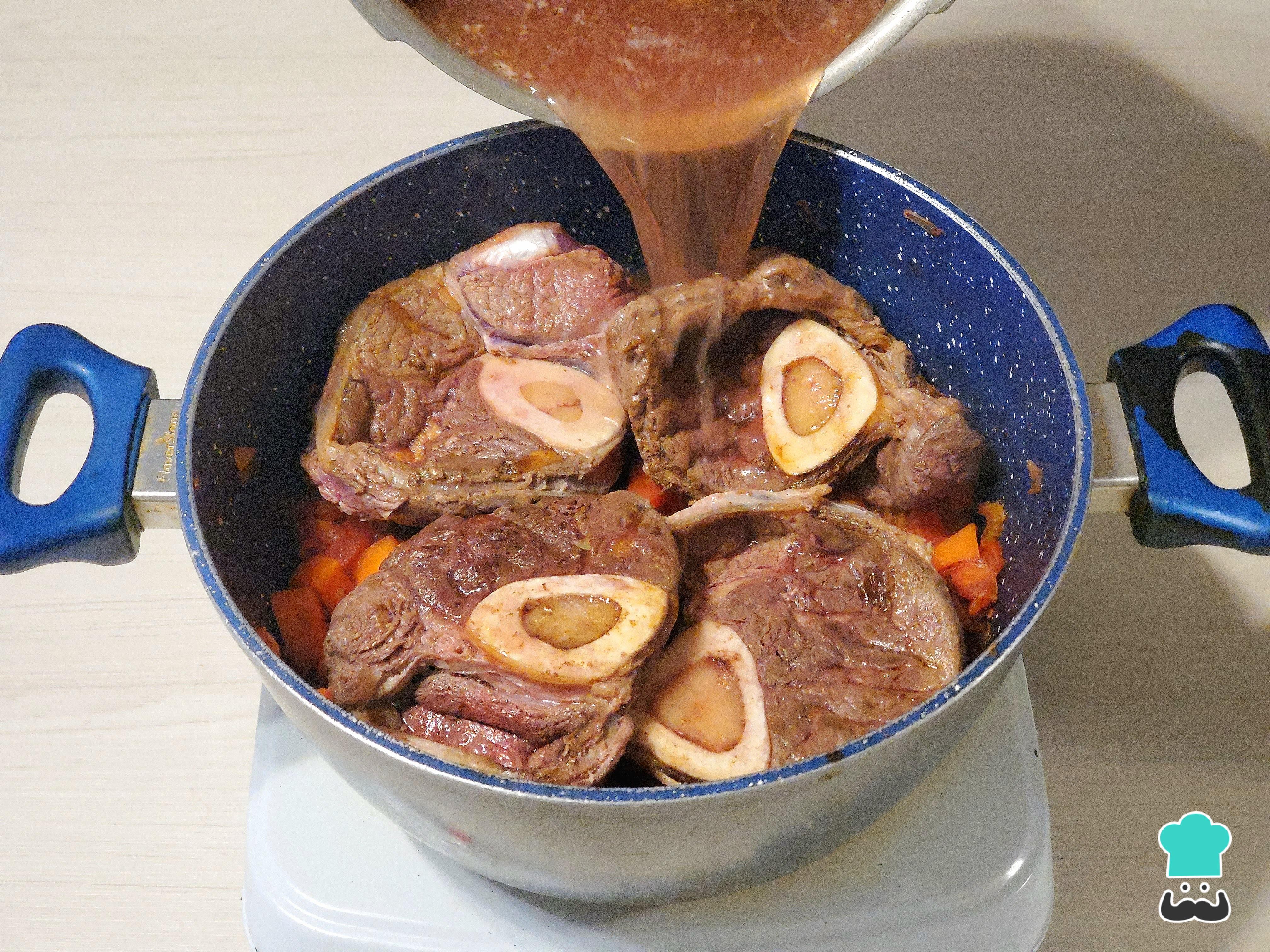 Reincorpora los medallones de osobuco y cubre con caldo de res o agua.