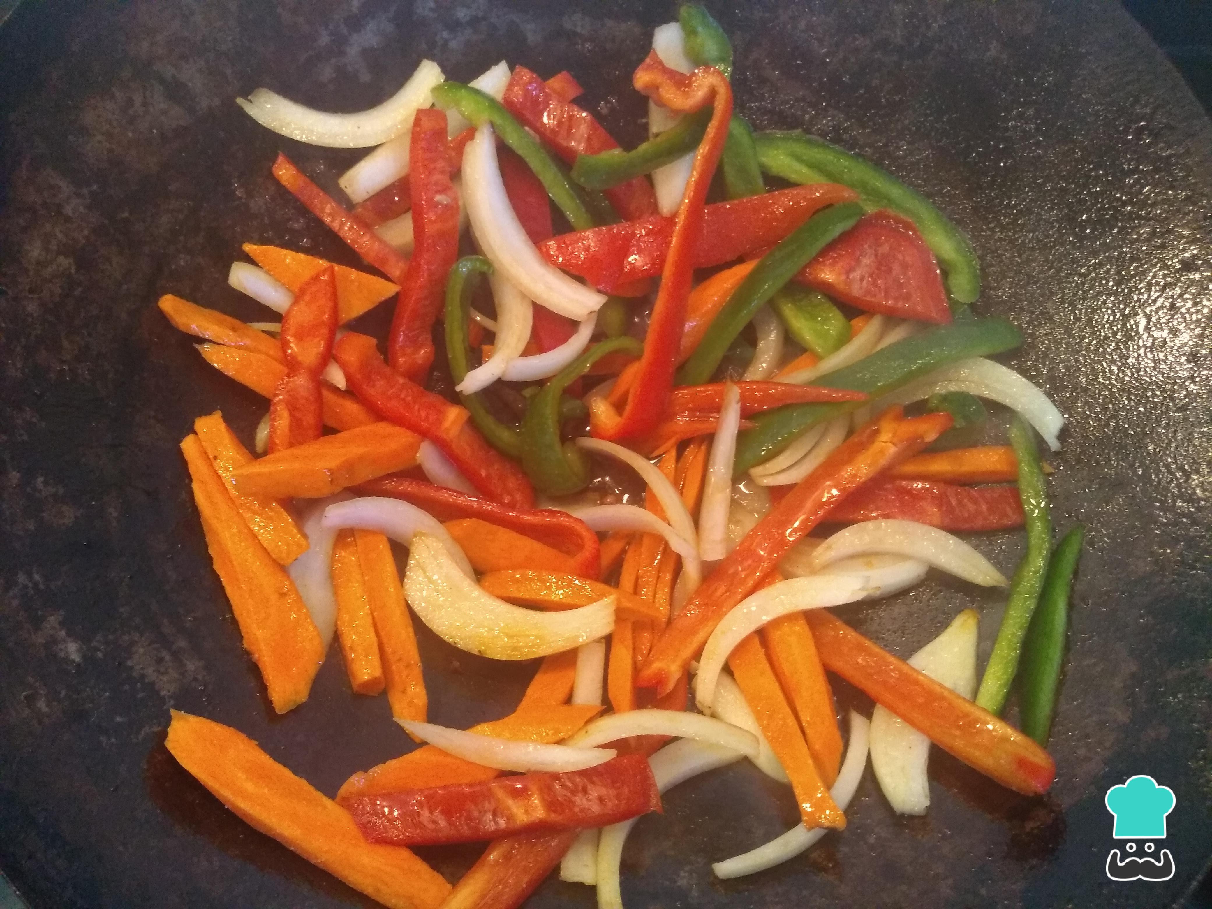Agrega un poco de aceite en el mismo disco y espera a que vuelva a tomar temperatura. Cuando esto haya sucedido, saltea los vegetales durante unos minutos.