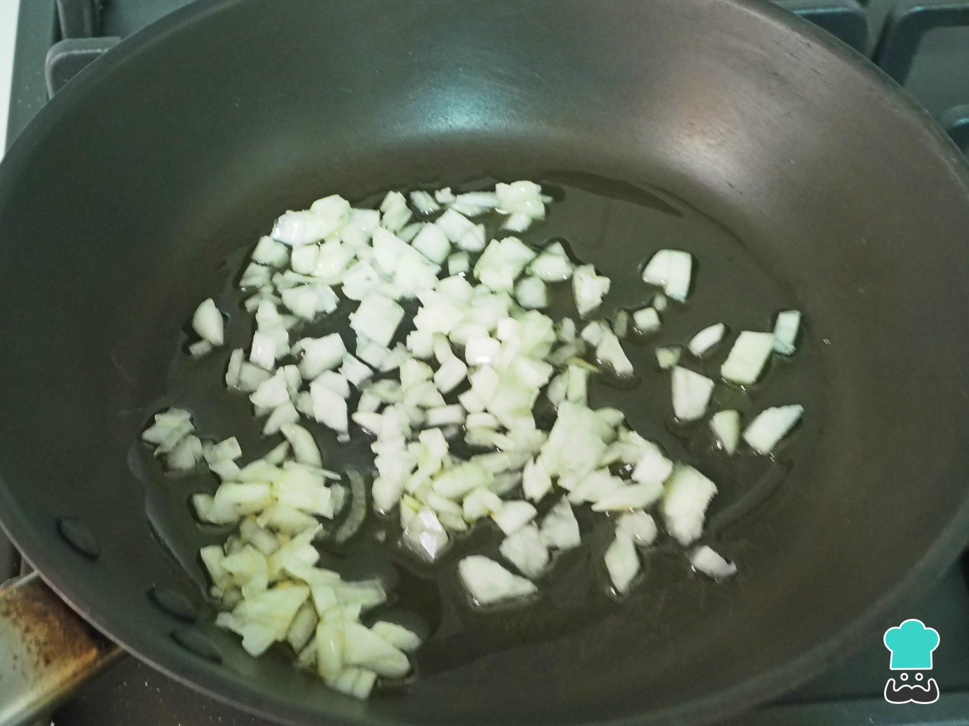 Picamos la cebolla y la ponemos a dorar en una sartén con un poco de aceite de oliva para empezar a preparar el sofrito de la paella de verduras y salmón.