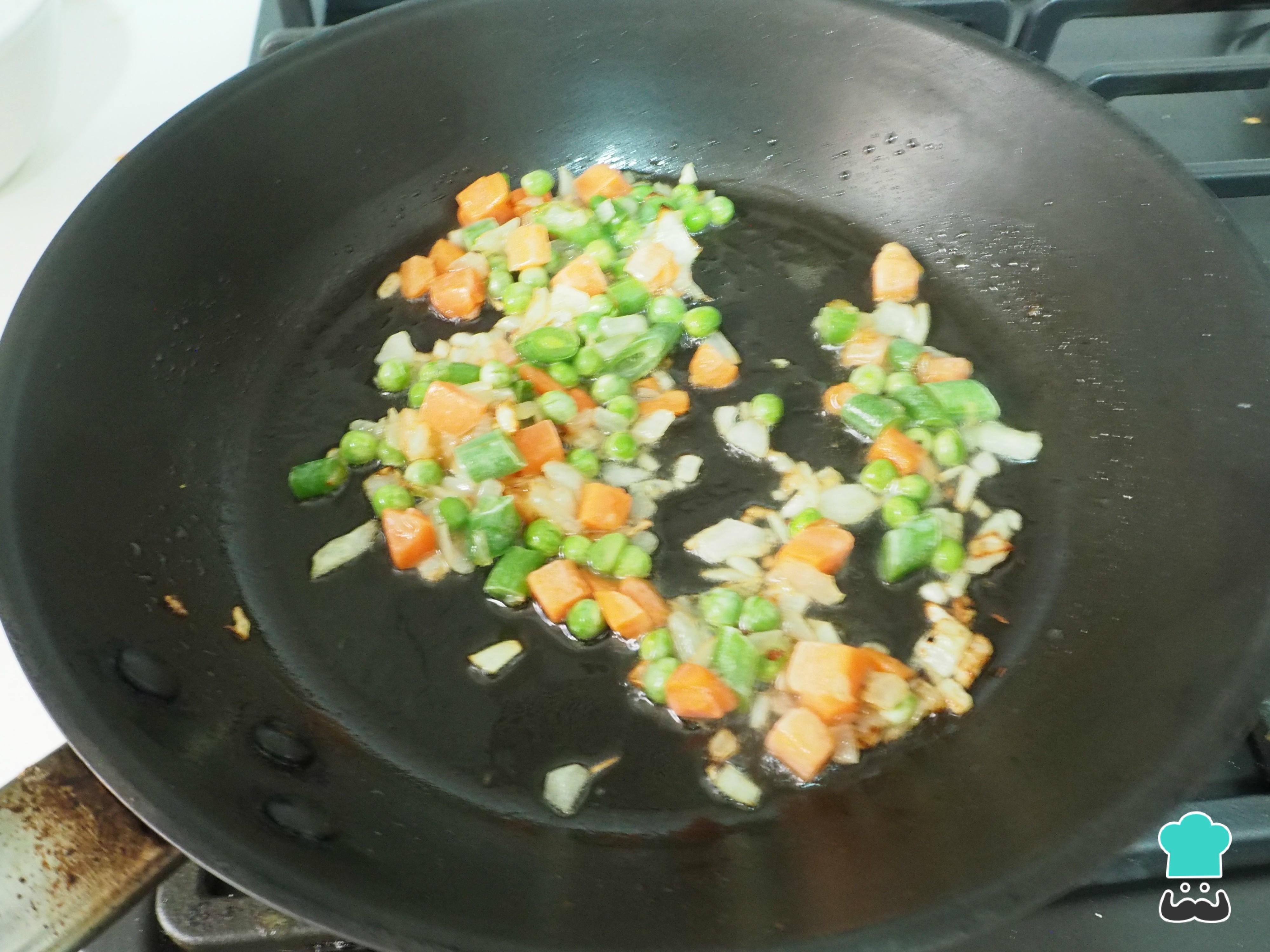 Añadimos la verdura y rehogamos cuando la cebolla esté tierna. Si lo prefieres, en lugar de usar menestra congelada puedes picar las verduras frescas que quieras incorporar a la receta.