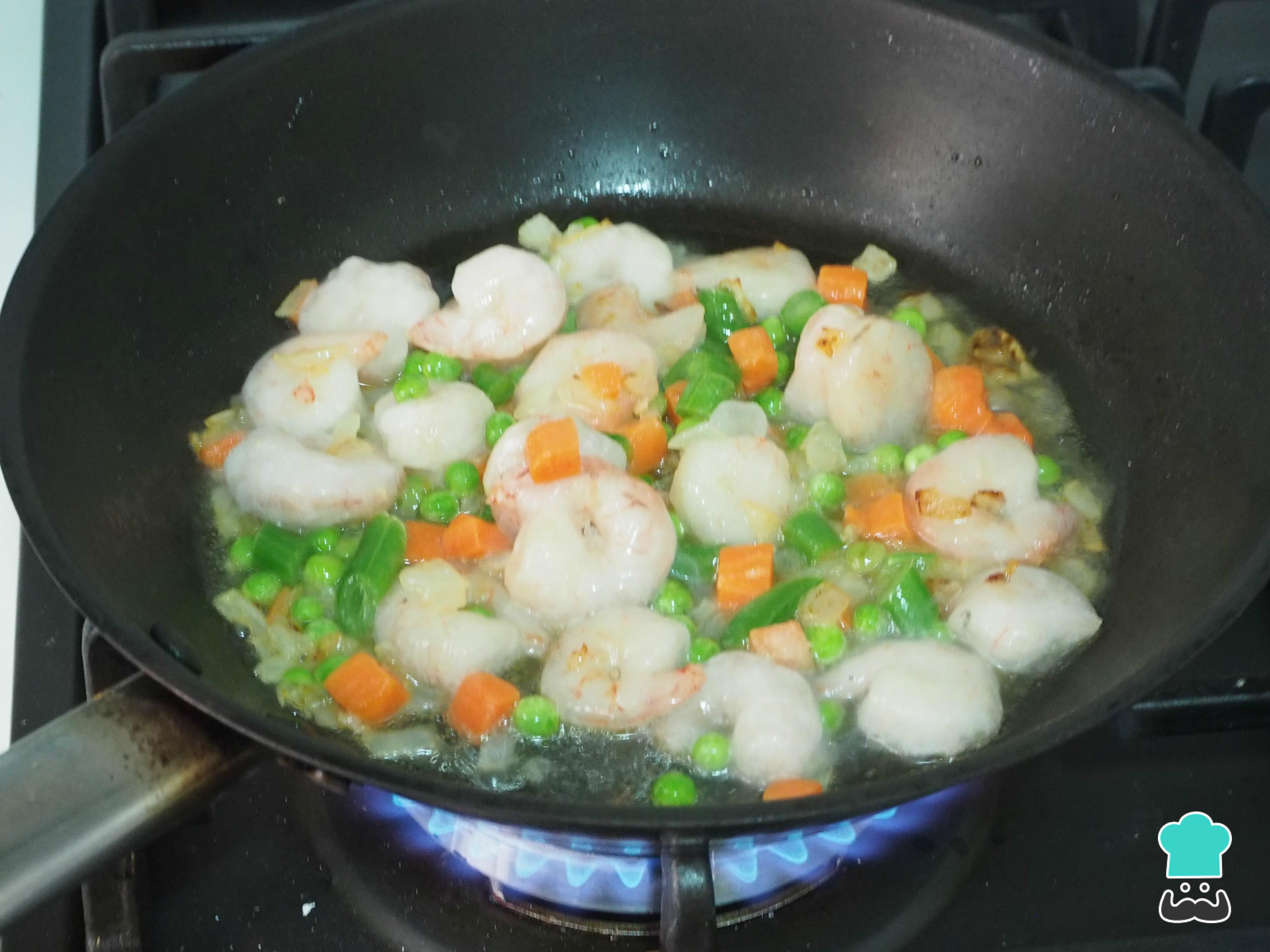A continuación, agregamos las gambas, mezclamos y dejamos cocinar un par de minutos.